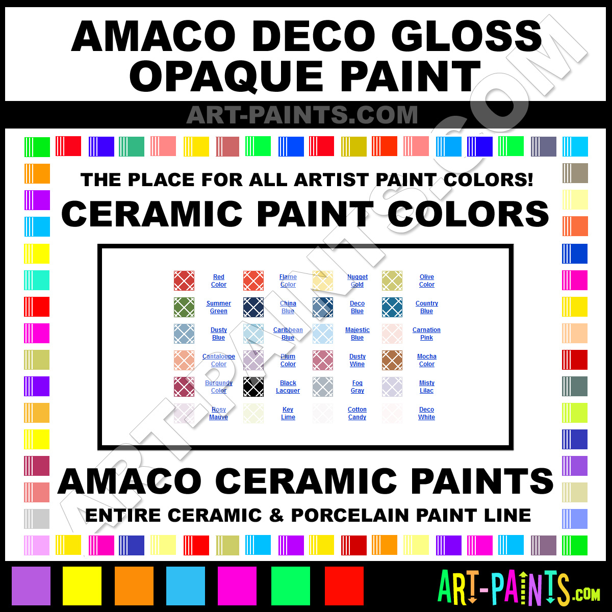 Amaco knows Ceramic paints! They make a wonderful brand of paint called Amaco Deco Gloss Opaque Ceramic Porcelain Colors that suits all types of artists. They strive to perfect the process of color and are one of the most popular Ceramic Porcelain Paint Brand companies in the world. Enjoy their entire paint brand collection from the list below. Amaco makes wonderful Artists Paints that everyone is sure to enjoy! Choose an Ceramic Porcelain Paint Color below to view that Hue and all their great related color paints. Paint on!     -Art-Paints.com