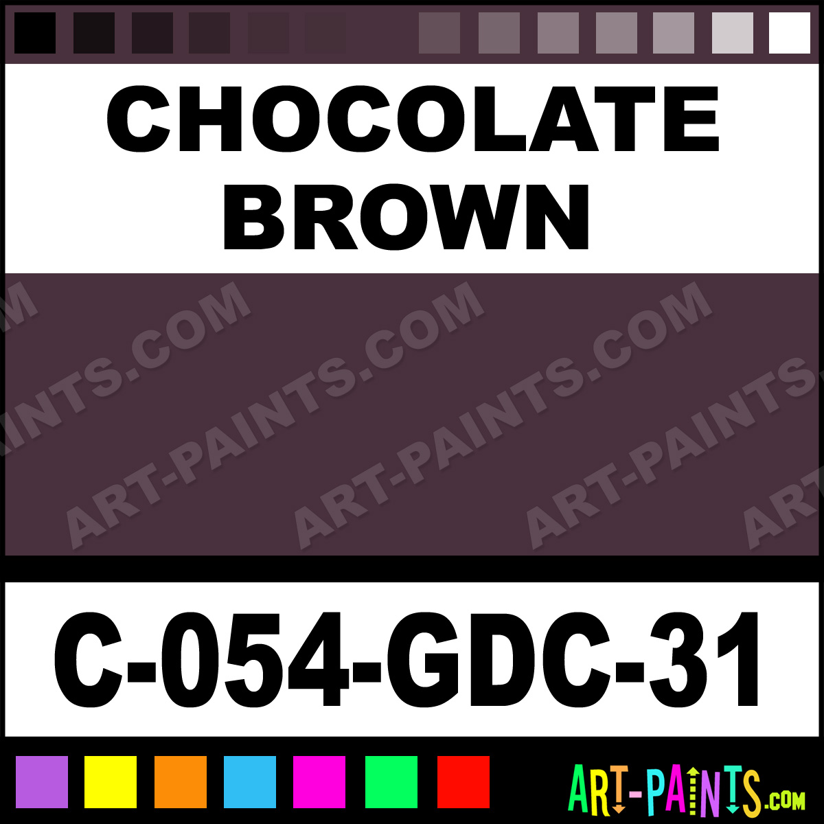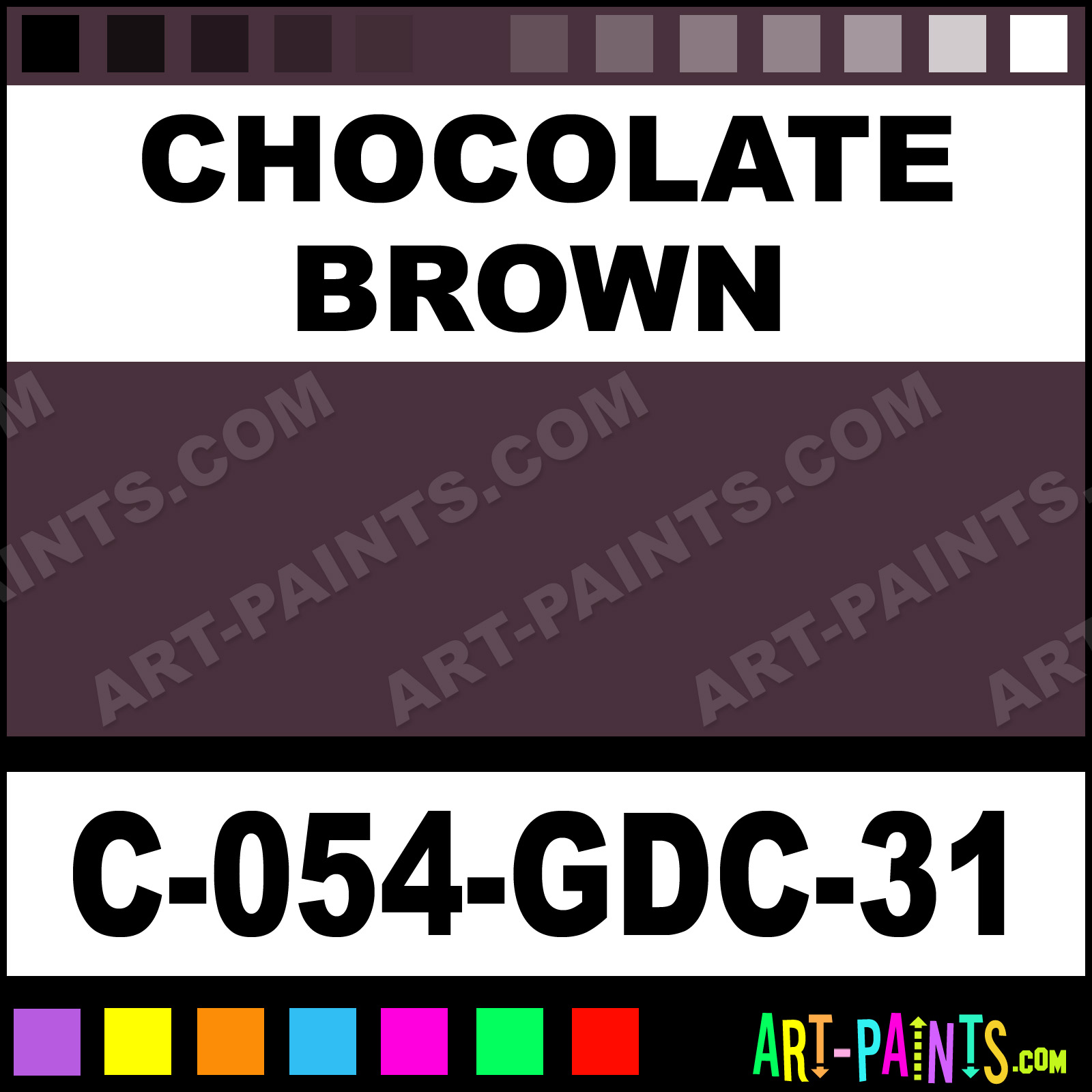 This beautiful Majolica Gloss Ceramic shade is called Chocolate Brown, and comes from a company called Amaco. Their product number, along with the HTML color code, RGB, and CMYK codes are listed below. This Beautiful Shade of Chocolate Brown and others can be found in the Amaco Majolica Gloss Art Paint Gallery! Also be sure to browse through the other wonderful Professional Color Galleries to see more of Amaco Majolica Gloss Ceramic Porcelain, Pottery, Bisque, Greenware Brand Paints and other Paint Manufacturers. And as always, Paint Paint Paint! -Art-Paints.com