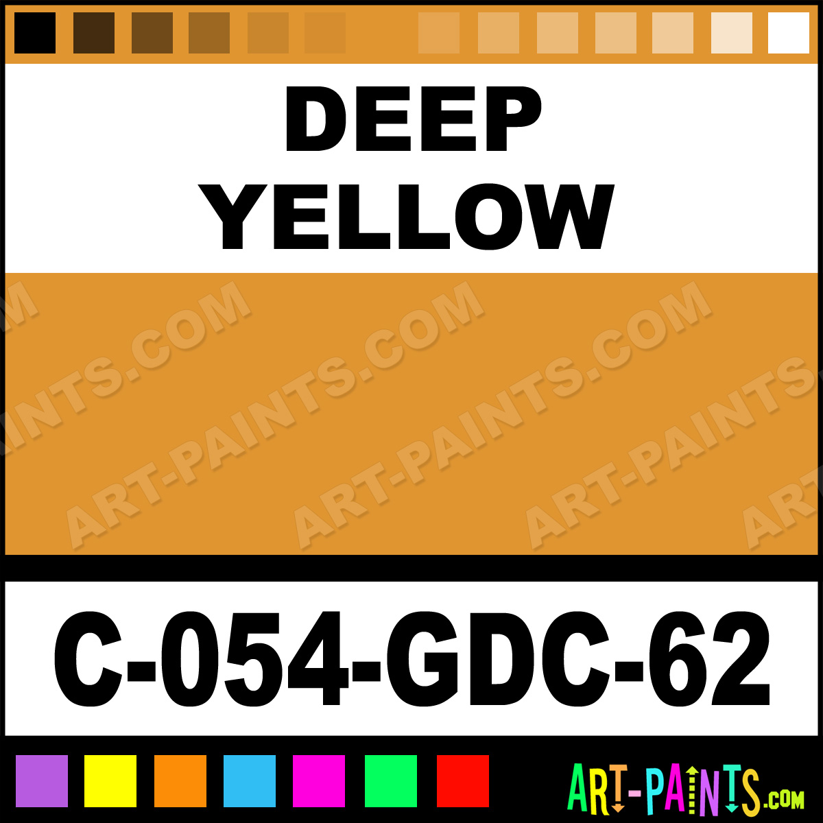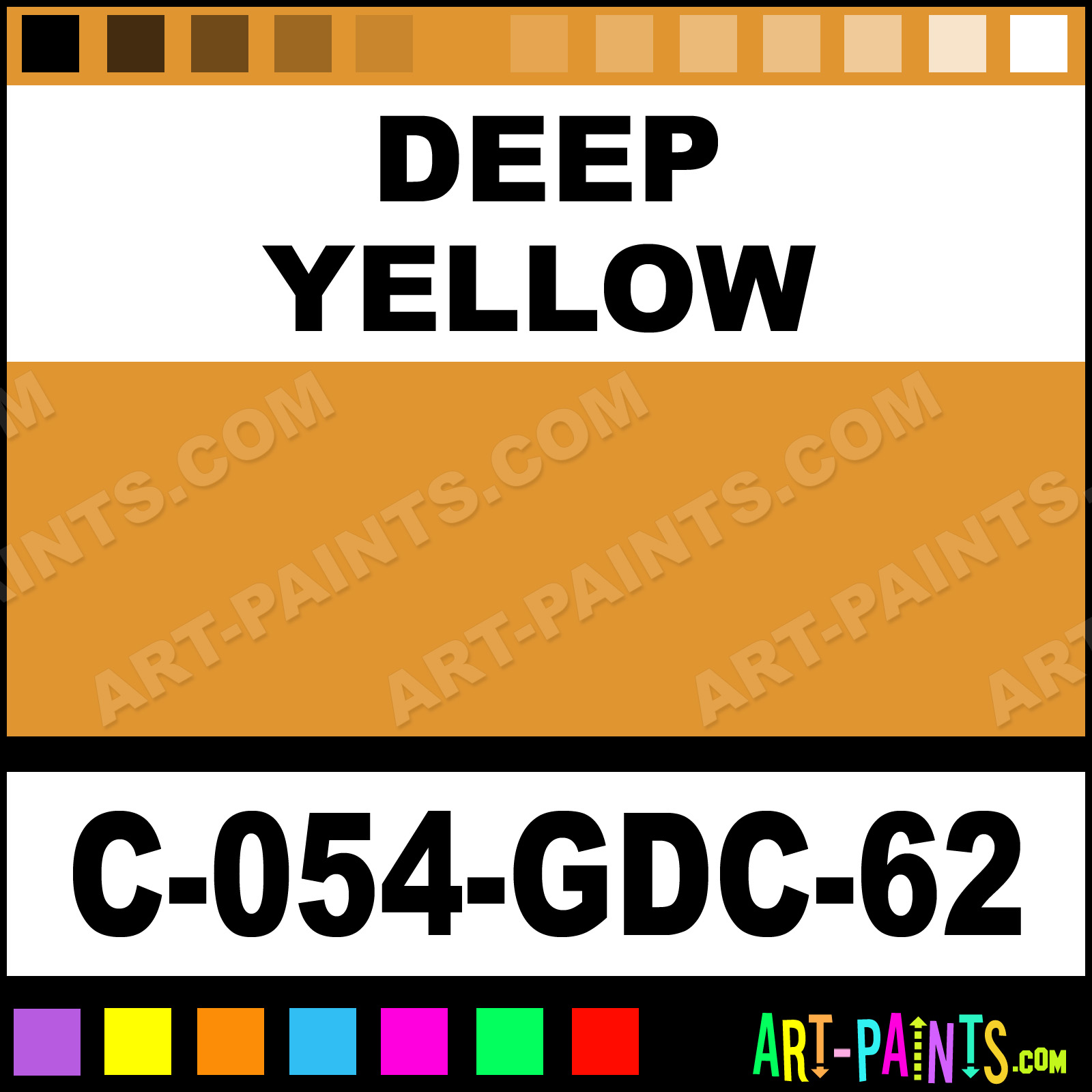This beautiful Majolica Gloss Ceramic shade is called Deep Yellow, and comes from a company called Amaco. Their product number, along with the HTML color code, RGB, and CMYK codes are listed below. This Beautiful Shade of Deep Yellow and others can be found in the Amaco Majolica Gloss Art Paint Gallery! Also be sure to browse through the other wonderful Professional Color Galleries to see more of Amaco Majolica Gloss Ceramic Porcelain, Pottery, Bisque, Greenware Brand Paints and other Paint Manufacturers. And as always, Paint Paint Paint! -Art-Paints.com