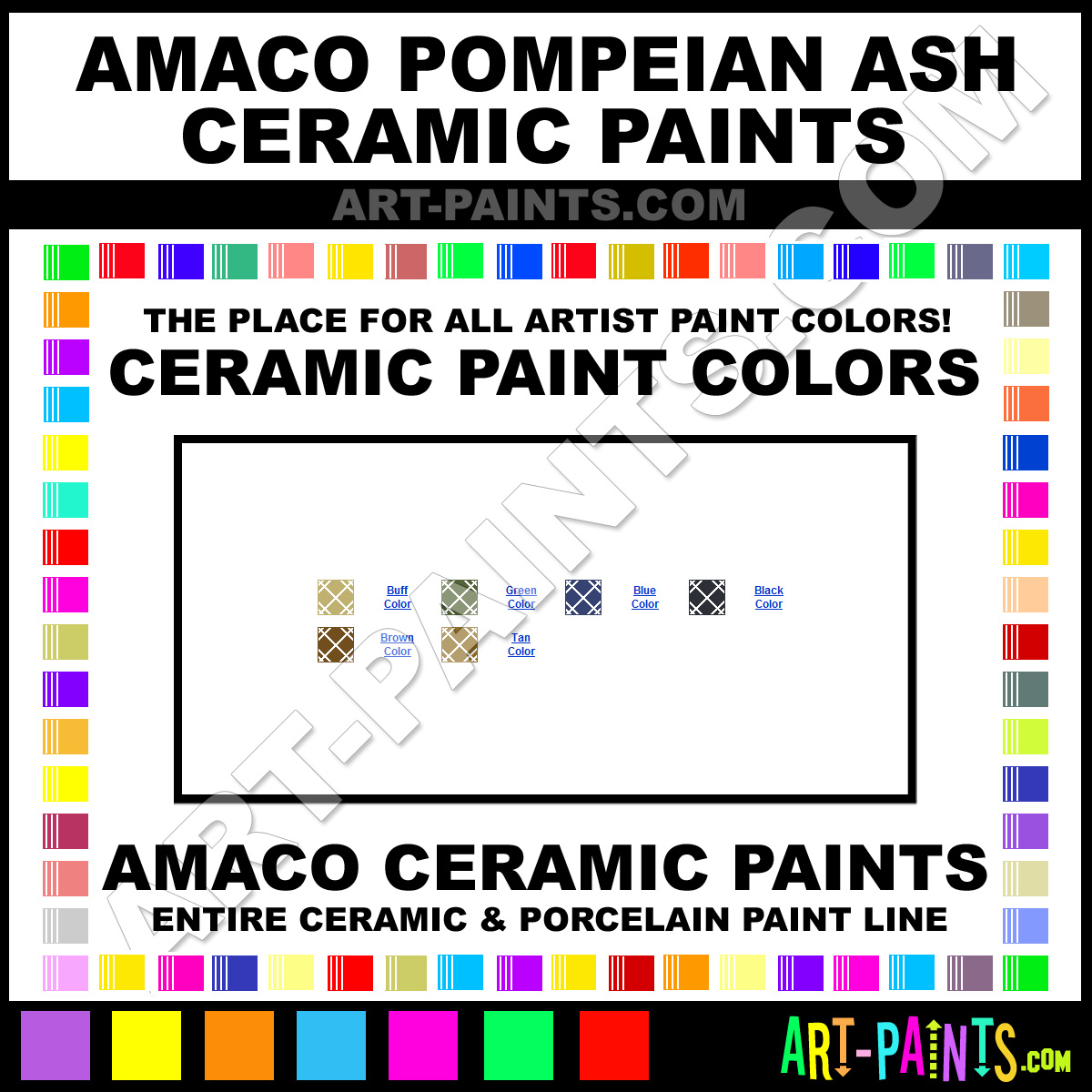 Amaco makes a beautiful Pompeian Ash Paint Brand. With a complete line of Ceramic Color Paints, 6 colors in all, available in beautiful hues and colors, they will no doubt keep you painting and smiling at the same time. Whether you use these Paints for Porcelain, Glass, Tile, Pottery, Bisque, Greenware, Glazes or Stains, this brand is very unique and exquisite!
