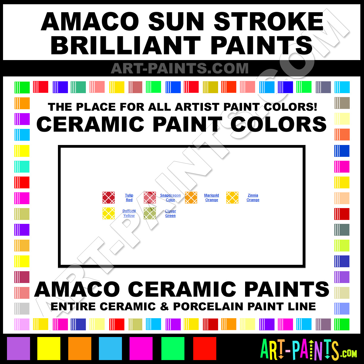 Amaco makes a beautiful Sun Stroke Brilliant Paint Brand. With a complete line of Ceramic Color Paints, 6 colors in all, available in beautiful hues and colors, they will no doubt keep you painting and smiling at the same time. Whether you use these Paints for Porcelain, Glass, Tile, Pottery, Bisque, Greenware, Glazes or Stains, this brand is very unique and exquisite!
