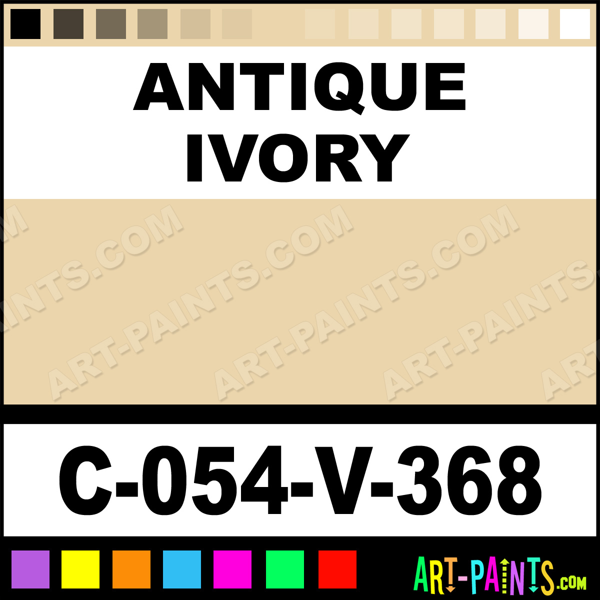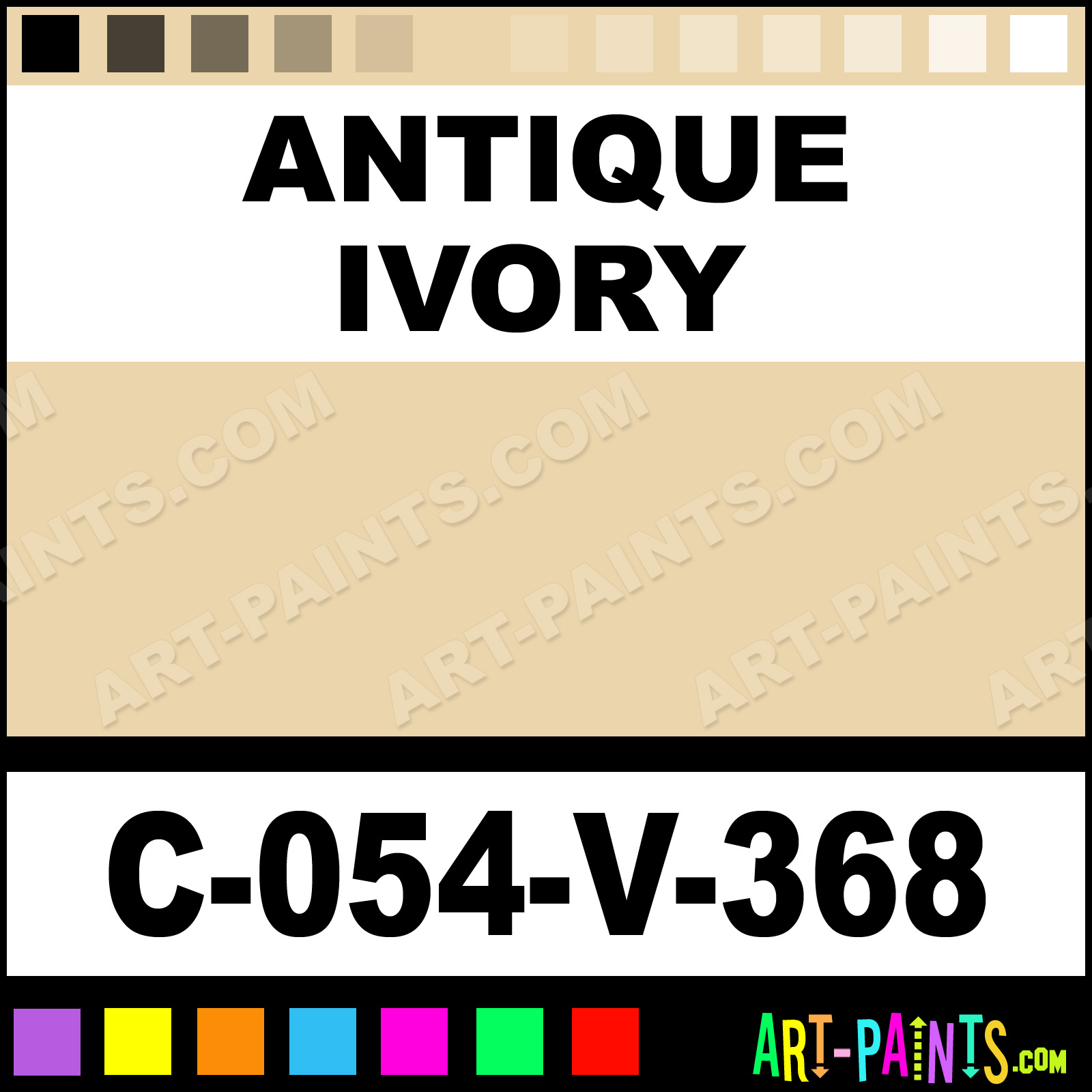 This beautiful Velvet Underglaze Ceramic shade is called Antique Ivory, and comes from a company called Amaco. Their product number, along with the HTML color code, RGB, and CMYK codes are listed below. This Beautiful Shade of Antique Ivory and others can be found in the Amaco Velvet Underglaze Art Paint Gallery! Also be sure to browse through the other wonderful Professional Color Galleries to see more of Amaco Velvet Underglaze Ceramic Porcelain, Pottery, Bisque, Greenware Brand Paints and other Paint Manufacturers. And as always, Paint Paint Paint! -Art-Paints.com