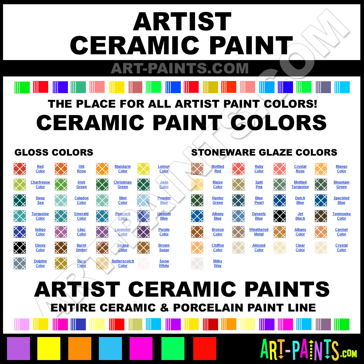 Artist makes beautiful Ceramic Porcelain, Pottery, Bisque, Greenware Paint brands. With a complete line of Gloss and Stoneware Glaze Ceramic Porcelain Lines, and 53 colors in all, available in just about every hue and color, they will no doubt keep you painting and smiling at the same time. Each Brand is unique and the variety of paints is exquisite!