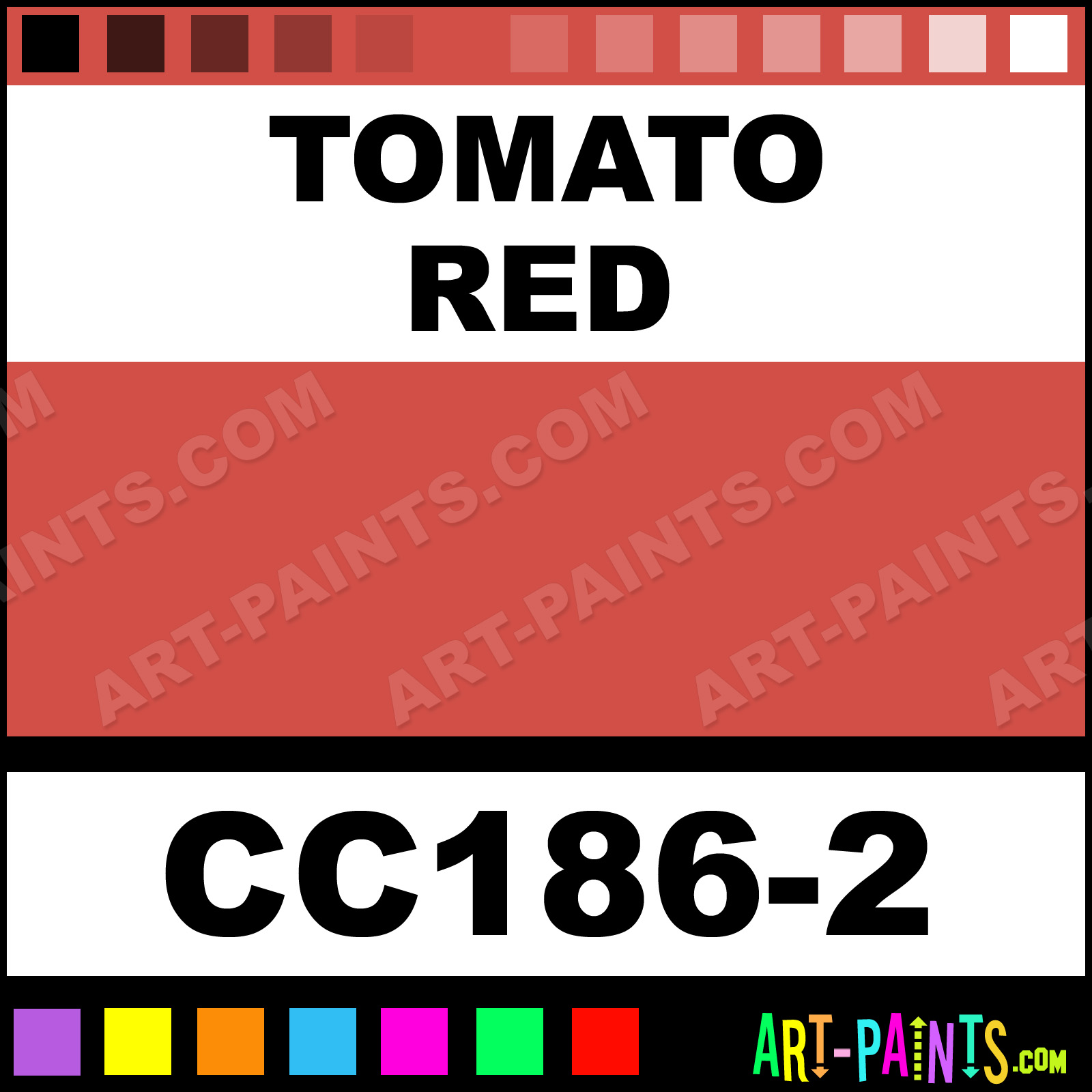 This beautiful Cover Coat Underglaze Ceramic shade is called Tomato Red, and comes from a company called Duncan. Their product number, along with the HTML color code, RGB, and CMYK codes are listed below. This Beautiful Shade of Tomato Red and others can be found in the Duncan Cover Coat Underglaze Art Paint Gallery! Also be sure to browse through the other wonderful Professional Color Galleries to see more of Duncan Cover Coat Underglaze Ceramic Porcelain, Pottery, Bisque, Greenware Brand Paints and other Paint Manufacturers. And as always, Paint Paint Paint! -Art-Paints.com