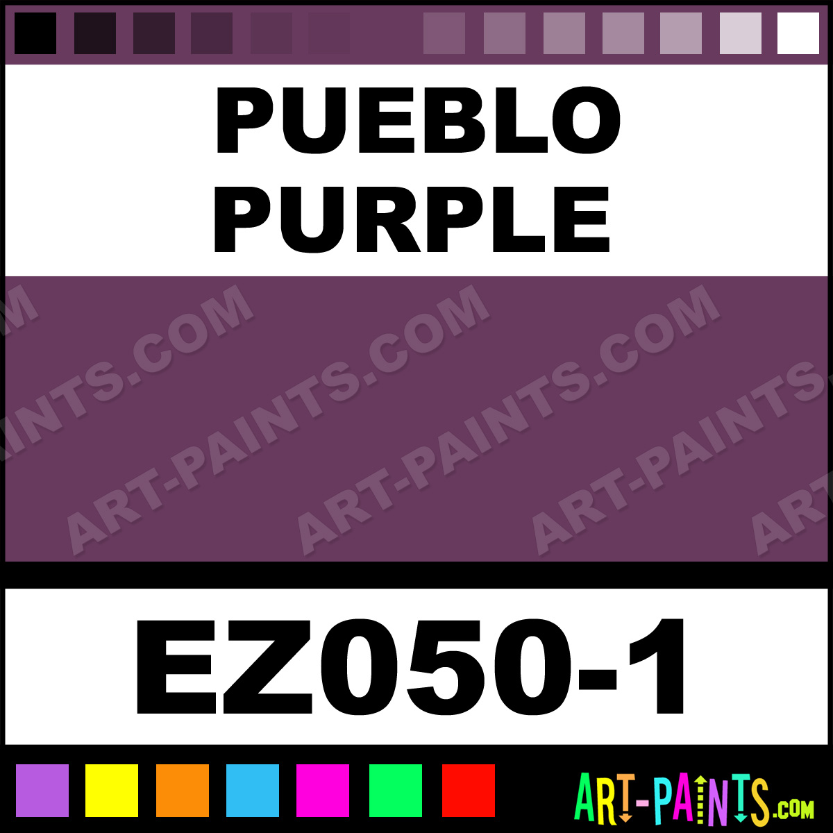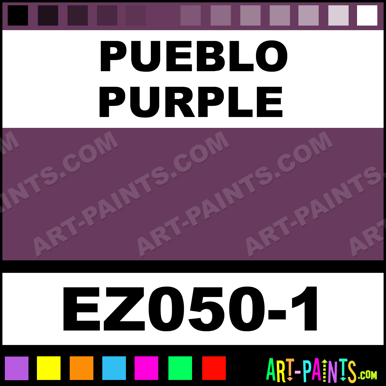 This beautiful EZ Stroke Ceramic shade is called Pueblo Purple, and comes from a company called Duncan. Their product number, along with the HTML color code, RGB, and CMYK codes are listed below. This Beautiful Shade of Pueblo Purple and others can be found in the Duncan EZ Stroke Art Paint Gallery! Also be sure to browse through the other wonderful Professional Color Galleries to see more of Duncan EZ Stroke Ceramic Porcelain, Pottery, Bisque, Greenware Brand Paints and other Paint Manufacturers. And as always, Paint Paint Paint! -Art-Paints.com