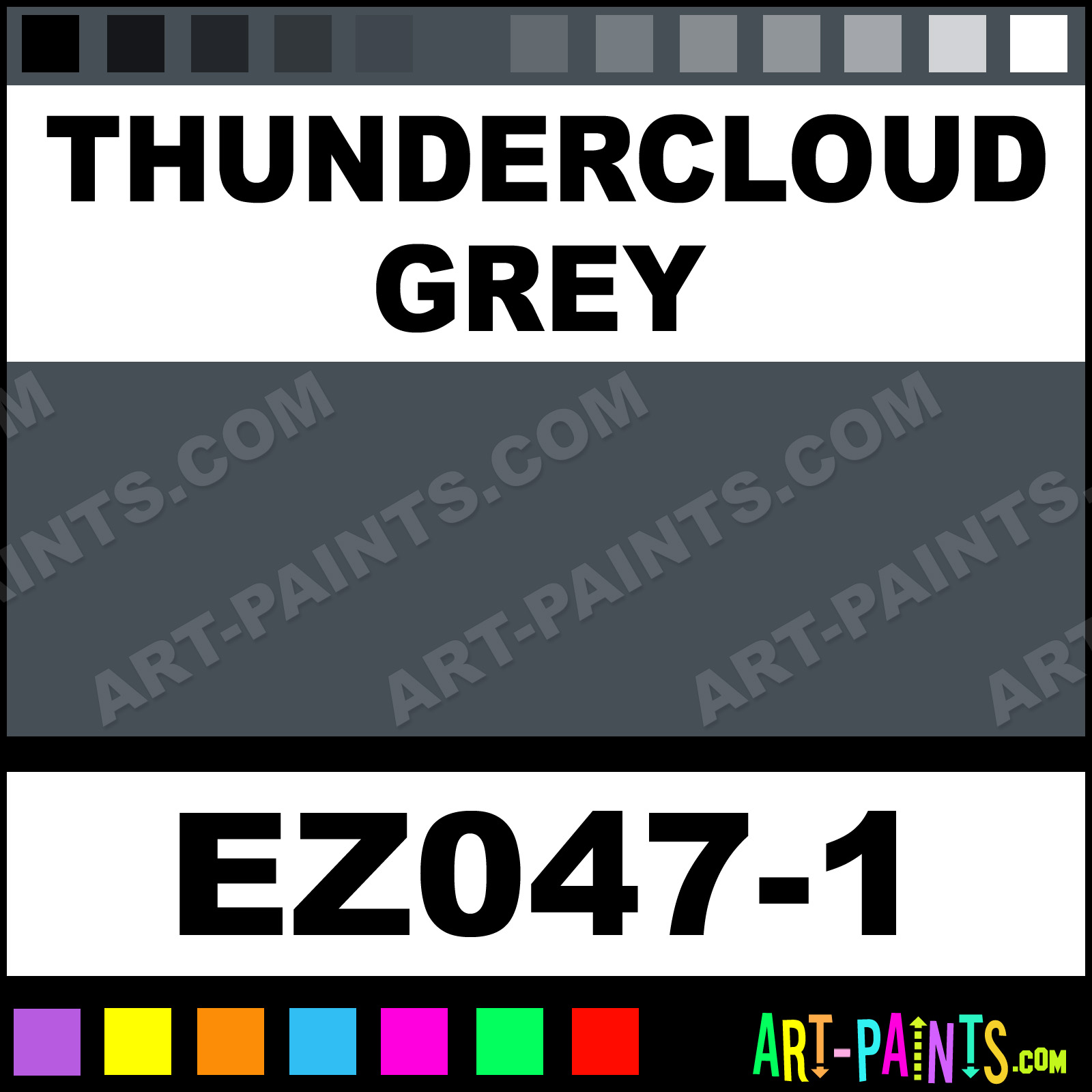 This beautiful EZ Stroke Ceramic shade is called Thundercloud Grey, and comes from a company called Duncan. Their product number, along with the HTML color code, RGB, and CMYK codes are listed below. This Beautiful Shade of Thundercloud Grey and others can be found in the Duncan EZ Stroke Art Paint Gallery! Also be sure to browse through the other wonderful Professional Color Galleries to see more of Duncan EZ Stroke Ceramic Porcelain, Pottery, Bisque, Greenware Brand Paints and other Paint Manufacturers. And as always, Paint Paint Paint! -Art-Paints.com