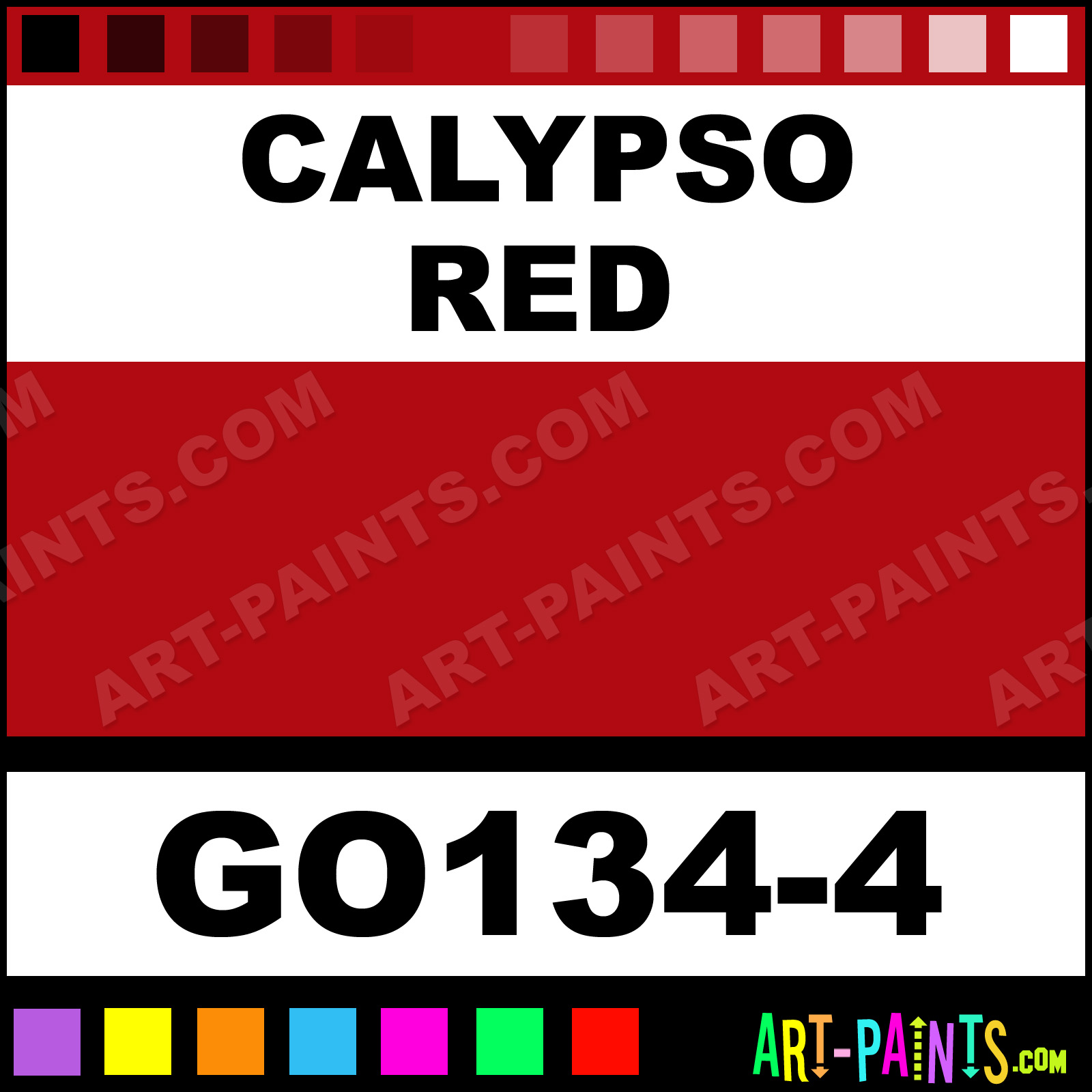 This beautiful Gallery Opaque Ceramic shade is called Calypso Red, and comes from a company called Duncan. Their product number, along with the HTML color code, RGB, and CMYK codes are listed below. This Beautiful Shade of Calypso Red and others can be found in the Duncan Gallery Opaque Art Paint Gallery! Also be sure to browse through the other wonderful Professional Color Galleries to see more of Duncan Gallery Opaque Ceramic Porcelain, Pottery, Bisque, Greenware Brand Paints and other Paint Manufacturers. And as always, Paint Paint Paint! -Art-Paints.com