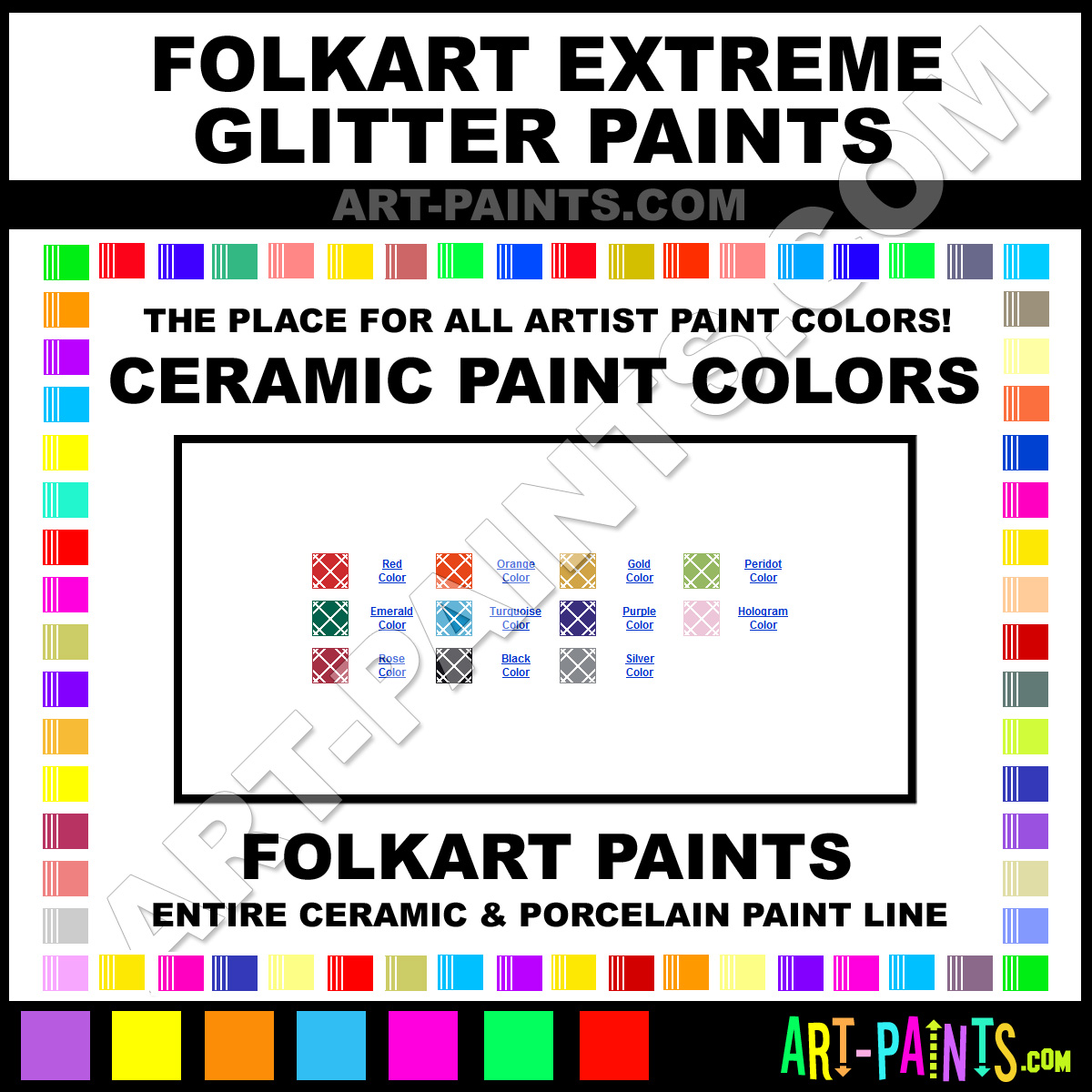 FolkArt makes a beautiful Extreme Glitter Paint Brand. With a complete line of Ceramic Color Paints, 11 colors in all, available in beautiful hues and colors, they will no doubt keep you painting and smiling at the same time. Whether you use these Paints for Porcelain, Glass, Tile, Pottery, Bisque, Greenware, Glazes or Stains, this brand is very unique and exquisite!