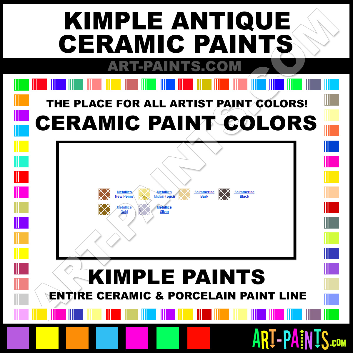 Kimple makes a beautiful Antique Paint Brand. With a complete line of Ceramic Color Paints, 6 colors in all, available in beautiful hues and colors, they will no doubt keep you painting and smiling at the same time. Whether you use these Paints for Porcelain, Glass, Tile, Pottery, Bisque, Greenware, Glazes or Stains, this brand is very unique and exquisite!