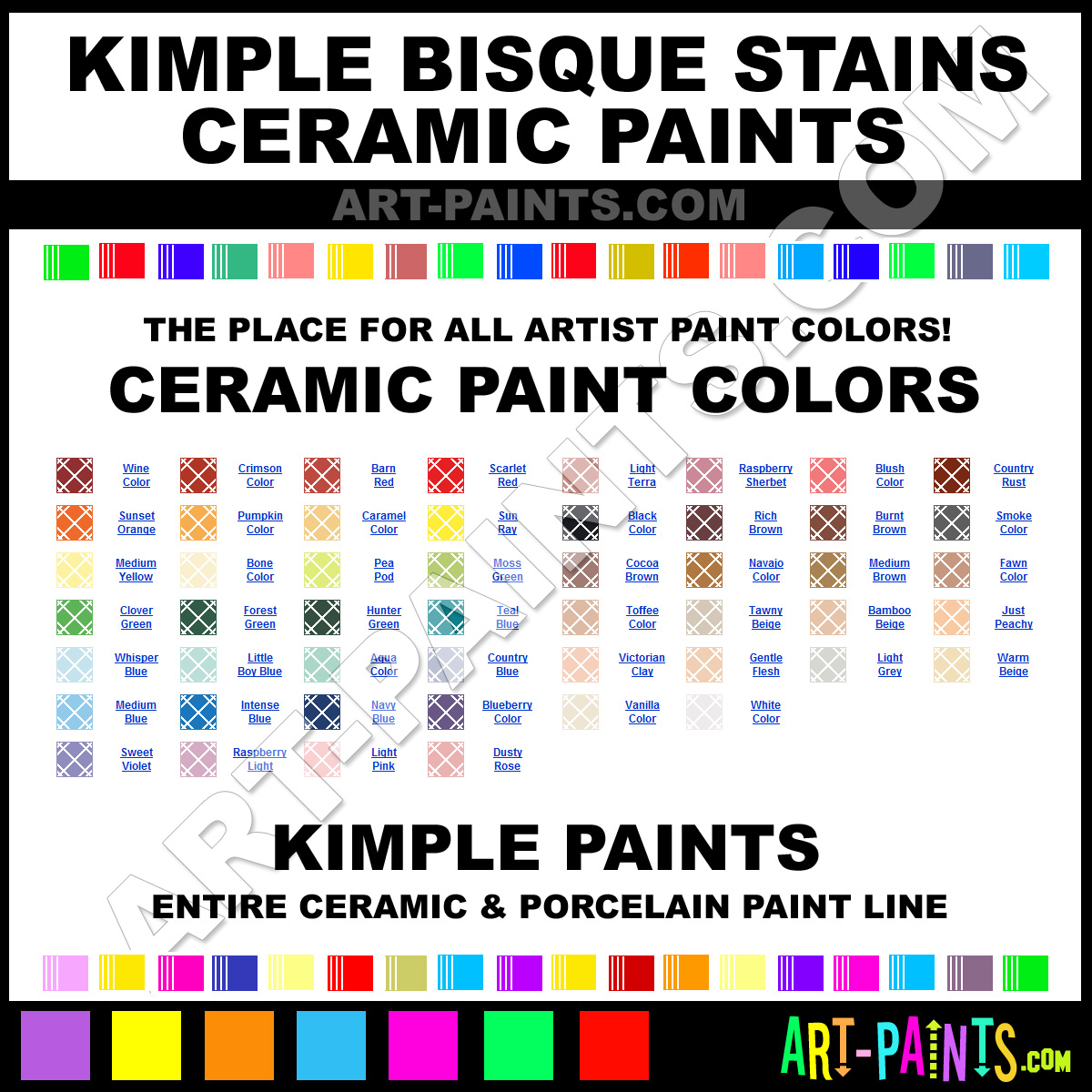 Kimple knows Ceramic paints! They make a wonderful brand of paint called Kimple Bisque Stains Ceramic Porcelain Colors that suits all types of artists. They strive to perfect the process of color and are one of the most popular Ceramic Porcelain Paint Brand companies in the world. Enjoy their entire paint brand collection from the list below. Kimple makes wonderful Artists Paints that everyone is sure to enjoy! Choose an Ceramic Porcelain Paint Color below to view that Hue and all their great related color paints. Paint on!     -Art-Paints.com