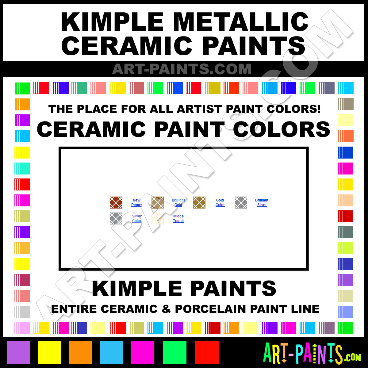 Kimple makes a beautiful Metallic Paint Brand. With a complete line of Ceramic Color Paints, 6 colors in all, available in beautiful hues and colors, they will no doubt keep you painting and smiling at the same time. Whether you use these Paints for Porcelain, Glass, Tile, Pottery, Bisque, Greenware, Glazes or Stains, this brand is very unique and exquisite!