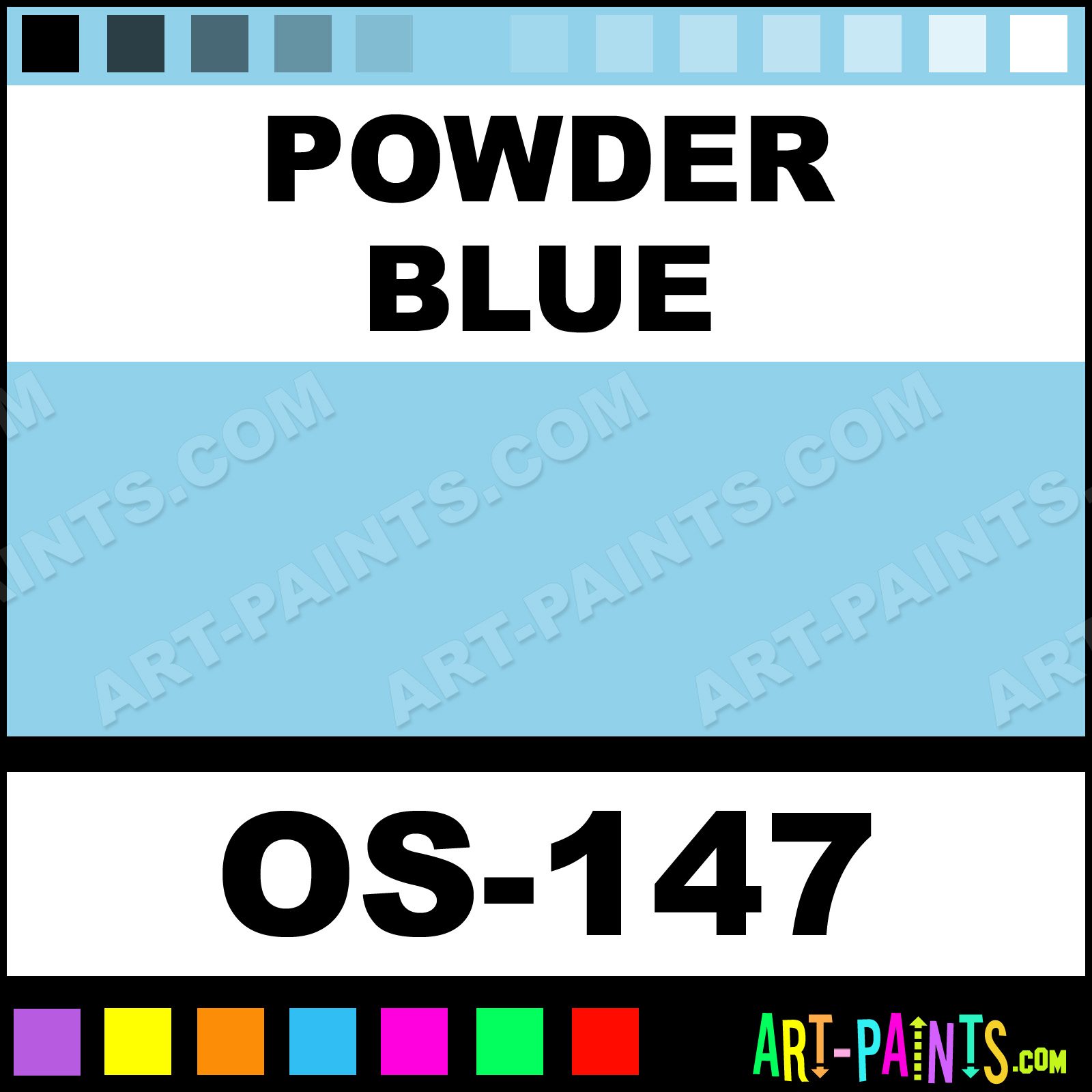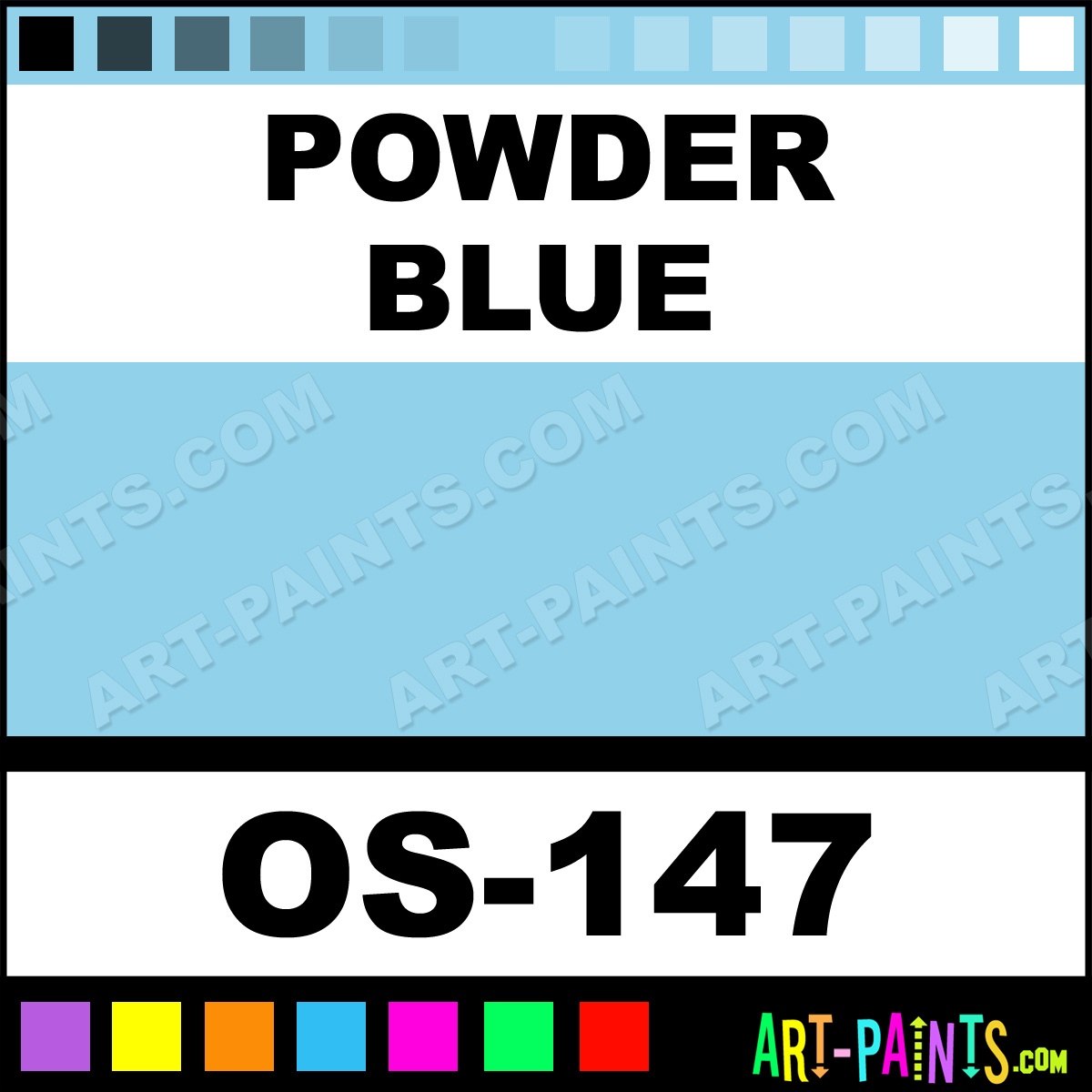 This beautiful One Stroke Translucent Ceramic shade is called Powder Blue, and comes from a company called Mayco. Their product number, along with the HTML color code, RGB, and CMYK codes are listed below. This Beautiful Shade of Powder Blue and others can be found in the Mayco One Stroke Translucent Art Paint Gallery! Also be sure to browse through the other wonderful Professional Color Galleries to see more of Mayco One Stroke Translucent Ceramic Porcelain, Pottery, Bisque, Greenware Brand Paints and other Paint Manufacturers. And as always, Paint Paint Paint! -Art-Paints.com