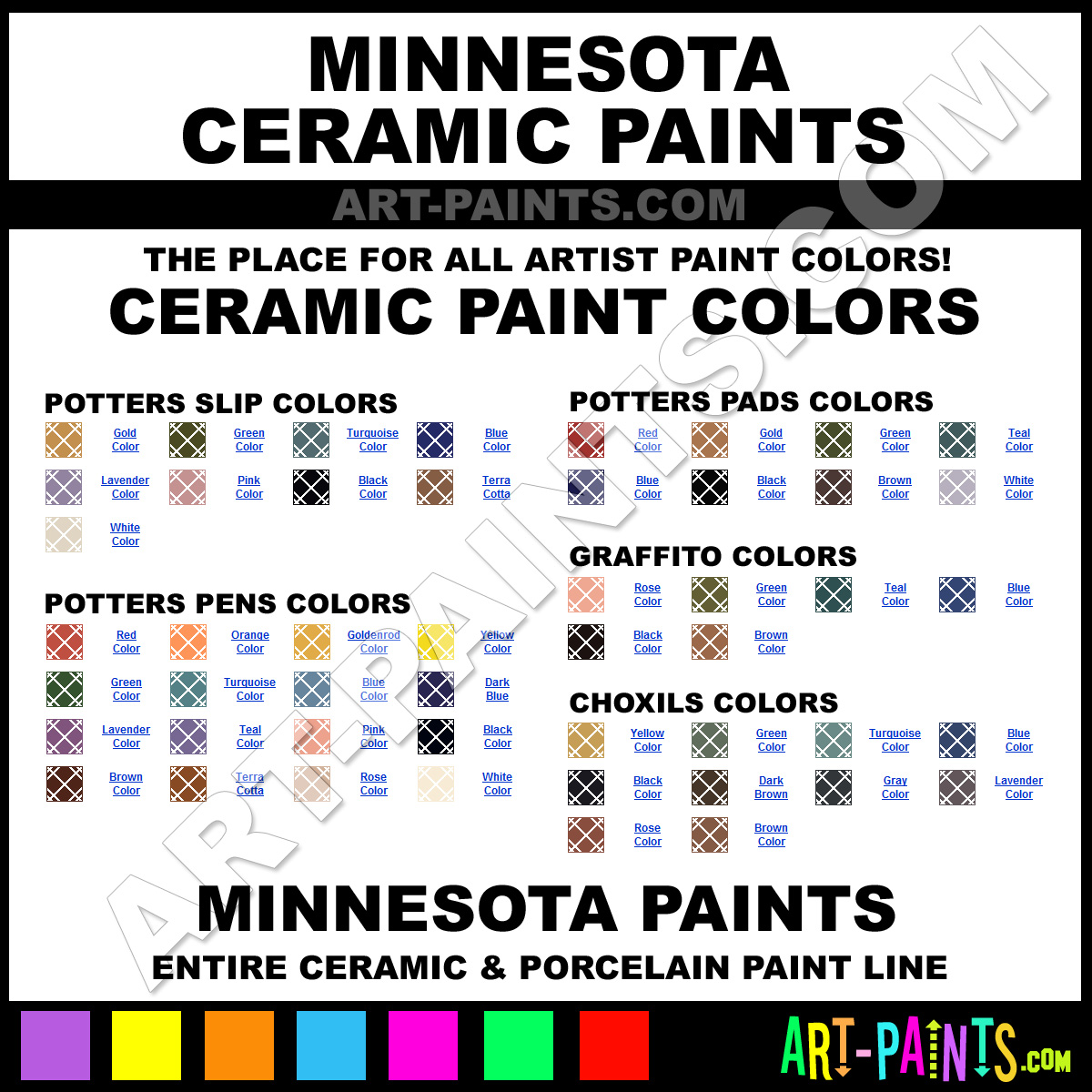 Minnesota makes beautiful Ceramic Porcelain, Pottery, Bisque, Greenware Paint brands. With a complete line of Choxils, Potters Pads, Potters Pens, Potters Slip Paints and Graffito Ceramic Porcelain Lines, and 49 colors in all, available in just about every hue and color, they will no doubt keep you painting and smiling at the same time. Each Brand is unique and the variety of paints is exquisite!