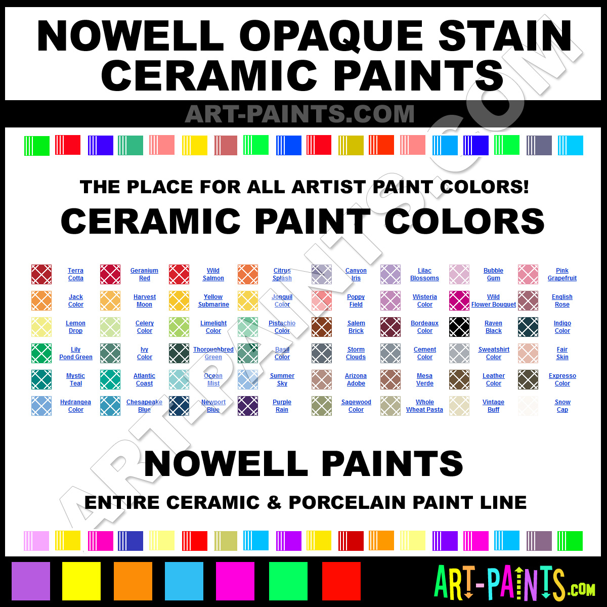 Nowell knows Ceramic paints! They make a wonderful brand of paint called Nowell Opaque Stain Ceramic Porcelain Colors that suits all types of artists. They strive to perfect the process of color and are one of the most popular Ceramic Porcelain Paint Brand companies in the world. Enjoy their entire paint brand collection from the list below. Nowell makes wonderful Artists Paints that everyone is sure to enjoy! Choose an Ceramic Porcelain Paint Color below to view that Hue and all their great related color paints. Paint on!     -Art-Paints.com