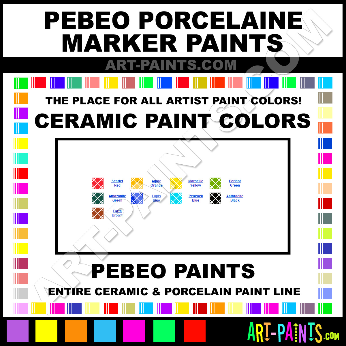 Pebeo knows Ceramic paints! They make a wonderful brand of paint called Pebeo Porcelaine Markers Ceramic Porcelain Colors that suits all types of artists. They strive to perfect the process of color and are one of the most popular Ceramic Porcelain Paint Brand companies in the world. Enjoy their entire paint brand collection from the list below. Pebeo makes wonderful Artists Paints that everyone is sure to enjoy! Choose an Ceramic Porcelain Paint Color below to view that Hue and all their great related color paints. Paint on!     -Art-Paints.com