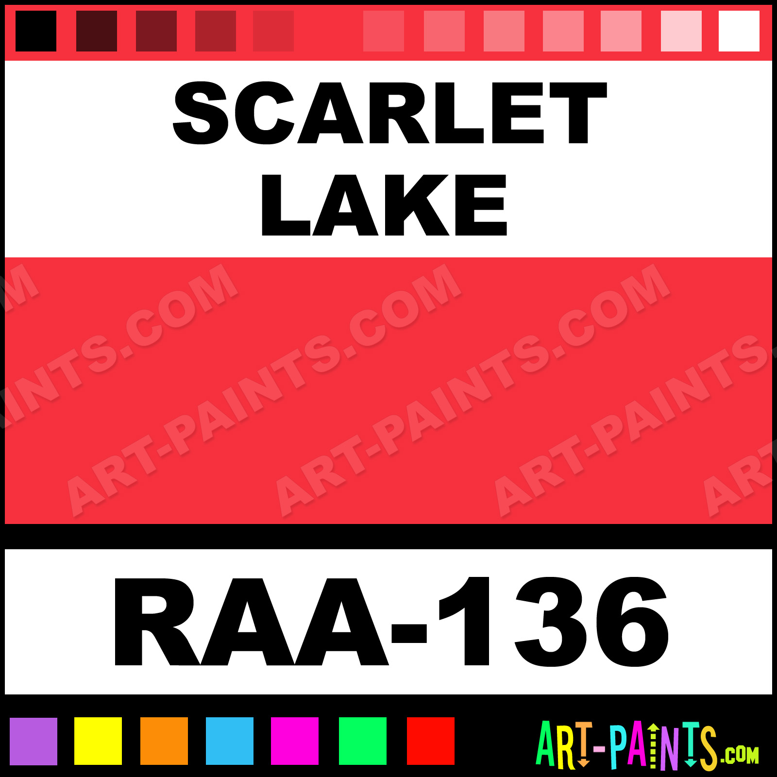 This beautiful Artist Ceramic Porcelain shade is called Scarlet Lake, and comes from a company called Royal and Langnickel. Their product number, along with the HTML color code, RGB, and CMYK codes are listed below. This Beautiful Shade of Scarlet Lake and others can be found in the Royal and Langnickel Artist Art Paint Gallery! Also be sure to browse through the other wonderful Professional Color Galleries to see more of Royal and Langnickel Artist Ceramic Porcelain, Pottery, Greenware, Bisque Brand Paints and other Paint Manufacturers. And as always, Paint Paint Paint! -Art-Paints.com