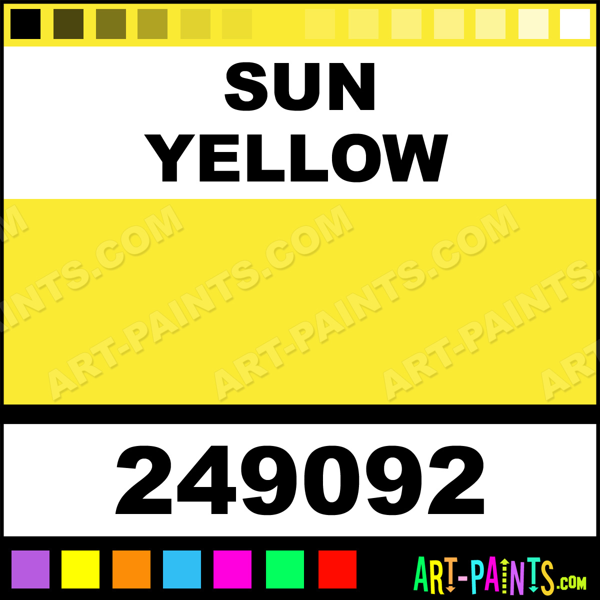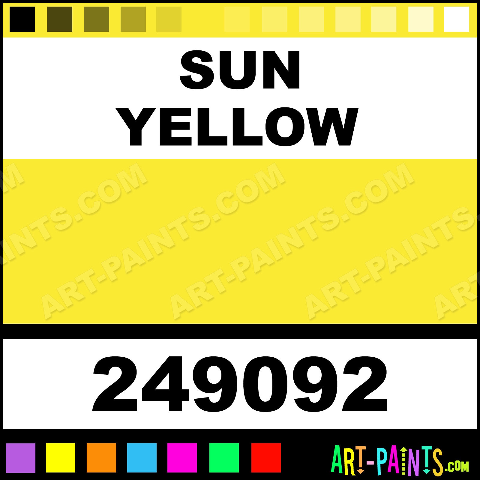 This beautiful Ultra Cover 2x Ceramic shade is called Sun Yellow, and comes from a company called Rust-Oleum. Their product number, along with the HTML color code, RGB, and CMYK codes are listed below. This Beautiful Shade of Sun Yellow and others can be found in the Rust-Oleum Ultra Cover 2x Art Paint Gallery! Also be sure to browse through the other wonderful Professional Color Galleries to see more of Rust-Oleum Ultra Cover 2x Ceramic Porcelain, Pottery, Bisque, Greenware Brand Paints and other Paint Manufacturers. And as always, Paint Paint Paint! -Art-Paints.com