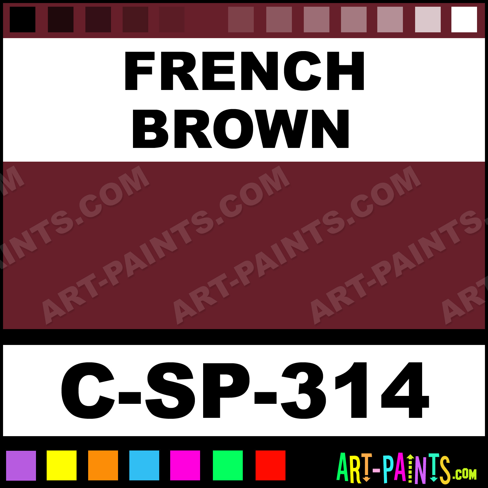 This beautiful 300 Series Ultraglaze Ceramic shade is called French Brown, and comes from a company called Spectrum. Their product number, along with the HTML color code, RGB, and CMYK codes are listed below. This Beautiful Shade of French Brown and others can be found in the Spectrum 300 Series Ultraglaze Art Paint Gallery! Also be sure to browse through the other wonderful Professional Color Galleries to see more of Spectrum 300 Series Ultraglaze Ceramic Porcelain, Pottery, Bisque, Greenware Brand Paints and other Paint Manufacturers. And as always, Paint Paint Paint! -Art-Paints.com