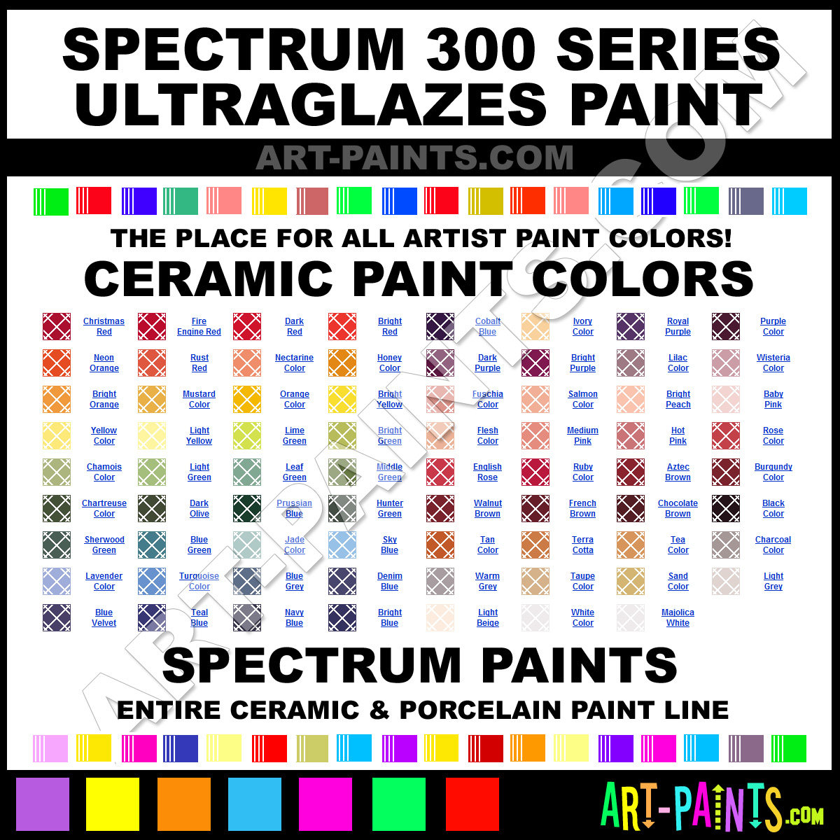 Spectrum knows Ceramic paints! They make a wonderful brand of paint called Spectrum 300 Series Ultraglaze Ceramic Porcelain Colors that suits all types of artists. They strive to perfect the process of color and are one of the most popular Ceramic Porcelain Paint Brand companies in the world. Enjoy their entire paint brand collection from the list below. Spectrum makes wonderful Artists Paints that everyone is sure to enjoy! Choose an Ceramic Porcelain Paint Color below to view that Hue and all their great related color paints. Paint on!     -Art-Paints.com