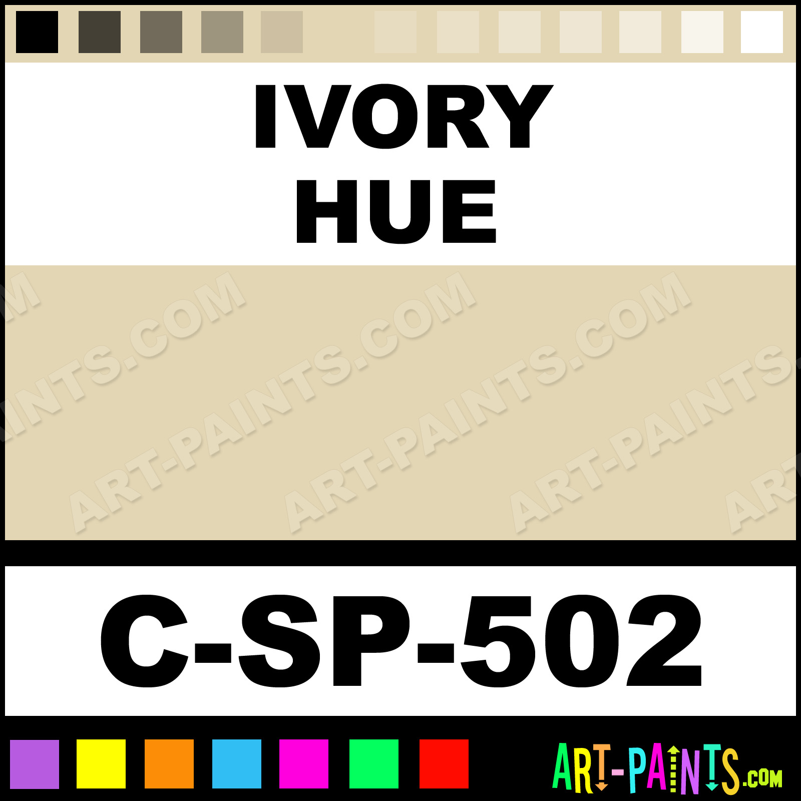 This beautiful 500 Series Underglaze Ceramic shade is called Ivory, and comes from a company called Spectrum. Their product number, along with the HTML color code, RGB, and CMYK codes are listed below. This Beautiful Shade of Ivory and others can be found in the Spectrum 500 Series Underglaze Art Paint Gallery! Also be sure to browse through the other wonderful Professional Color Galleries to see more of Spectrum 500 Series Underglaze Ceramic Porcelain, Pottery, Bisque, Greenware Brand Paints and other Paint Manufacturers. And as always, Paint Paint Paint! -Art-Paints.com