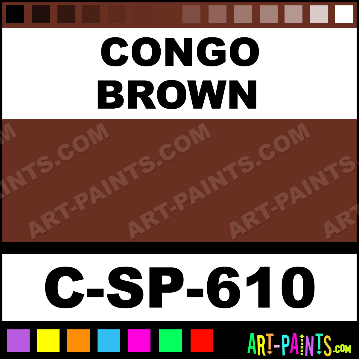 This beautiful 600 Series Underglaze Ceramic shade is called Congo Brown, and comes from a company called Spectrum. Their product number, along with the HTML color code, RGB, and CMYK codes are listed below. This Beautiful Shade of Congo Brown and others can be found in the Spectrum 600 Series Underglaze Art Paint Gallery! Also be sure to browse through the other wonderful Professional Color Galleries to see more of Spectrum 600 Series Underglaze Ceramic Porcelain, Pottery, Bisque, Greenware Brand Paints and other Paint Manufacturers. And as always, Paint Paint Paint! -Art-Paints.com