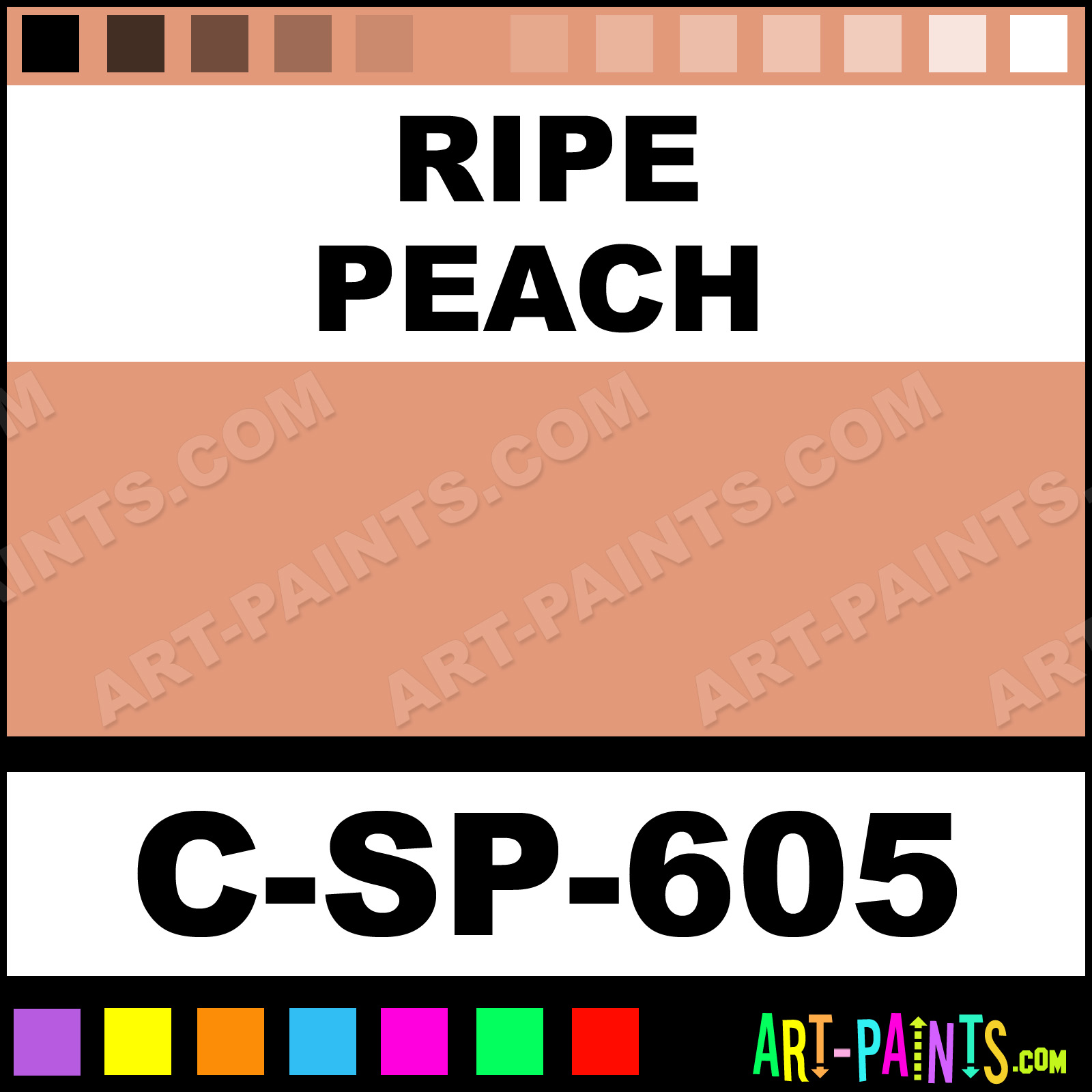 This beautiful 600 Series Underglaze Ceramic shade is called Ripe Peach, and comes from a company called Spectrum. Their product number, along with the HTML color code, RGB, and CMYK codes are listed below. This Beautiful Shade of Ripe Peach and others can be found in the Spectrum 600 Series Underglaze Art Paint Gallery! Also be sure to browse through the other wonderful Professional Color Galleries to see more of Spectrum 600 Series Underglaze Ceramic Porcelain, Pottery, Bisque, Greenware Brand Paints and other Paint Manufacturers. And as always, Paint Paint Paint! -Art-Paints.com