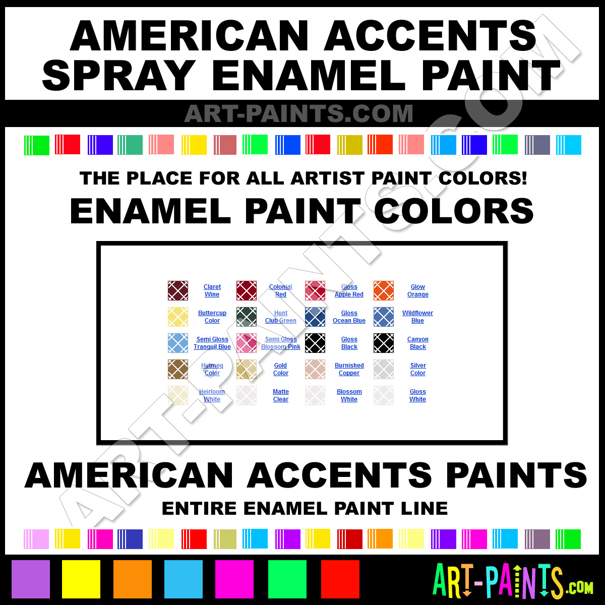 American Accents knows Enamel paints! They make a wonderful brand of paint called American Accents Spray Enamel Colors that suits all types of artists. They strive to perfect the process of color and are one of the most popular Enamel Paint Brand companies in the world. Enjoy their entire paint brand collection from the list below. American Accents makes wonderful Artists Paints that everyone is sure to enjoy! Choose an Enamel Paint Color below to view that Hue and all their great related color paints. Paint on!     -Art-Paints.com