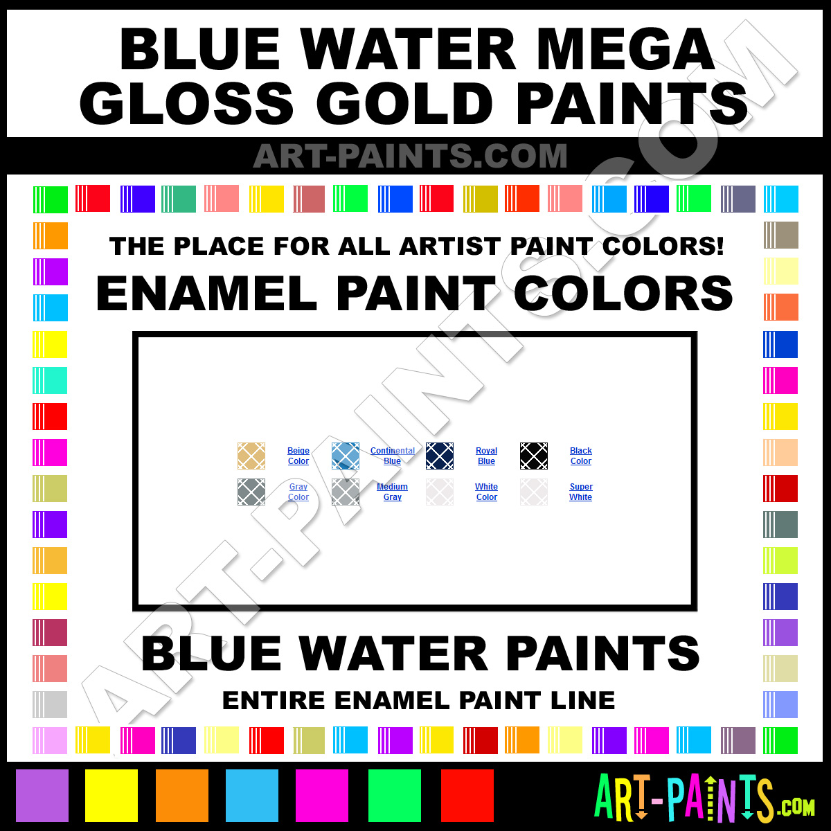 Blue Water knows Enamel paints! They make a wonderful brand of paint called Blue Water Mega Gloss Gold Enamel Colors that suits all types of artists. They strive to perfect the process of color and are one of the most popular Enamel Paint Brand companies in the world. Enjoy their entire paint brand collection from the list below. Blue Water makes wonderful Artists Paints that everyone is sure to enjoy! Choose an Enamel Paint Color below to view that Hue and all their great related color paints. Paint on!     -Art-Paints.com
