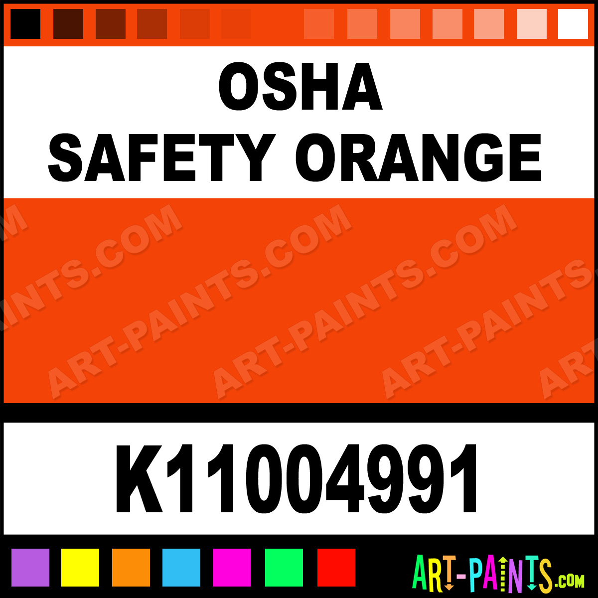 This beautiful Iron Guard Enamel shade is called OSHA Safety Orange, and comes from a company called Krylon. Their product number, along with the HTML color code, RGB, and CMYK codes are listed below. This Beautiful Shade of OSHA Safety Orange and others can be found in the Krylon Iron Guard Art Paint Gallery! Also be sure to browse through the other wonderful Professional Color Galleries to see more of Krylon Iron Guard Enamel Brand Paints and other Paint Manufacturers. And as always, Paint Paint Paint! -Art-Paints.com