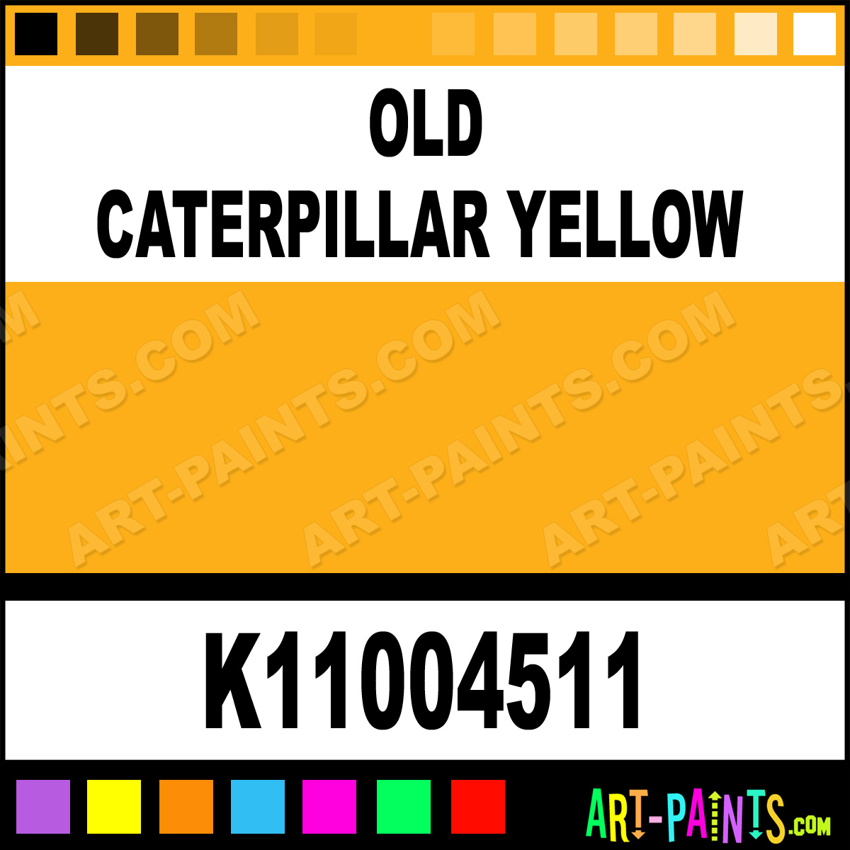This beautiful Iron Guard Enamel shade is called Old Caterpillar Yellow, and comes from a company called Krylon. Their product number, along with the HTML color code, RGB, and CMYK codes are listed below. This Beautiful Shade of Old Caterpillar Yellow and others can be found in the Krylon Iron Guard Art Paint Gallery! Also be sure to browse through the other wonderful Professional Color Galleries to see more of Krylon Iron Guard Enamel Brand Paints and other Paint Manufacturers. And as always, Paint Paint Paint! -Art-Paints.com