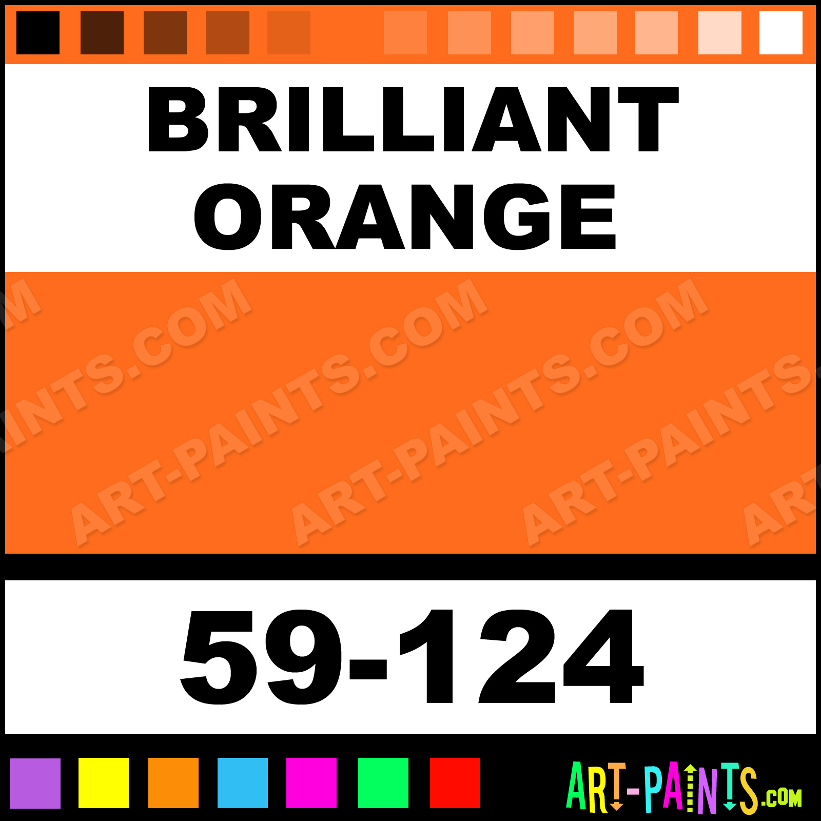 This beautiful 59000 Series Ink Enamel shade is called Brilliant Orange, and comes from a company called Naz-Dar. Their product number, along with the HTML color code, RGB, and CMYK codes are listed below. This Beautiful Shade of Brilliant Orange and others can be found in the Naz-Dar 59000 Series Ink Art Paint Gallery! Also be sure to browse through the other wonderful Professional Color Galleries to see more of Naz-Dar 59000 Series Ink Enamel Brand Paints and other Paint Manufacturers. And as always, Paint Paint Paint! -Art-Paints.com