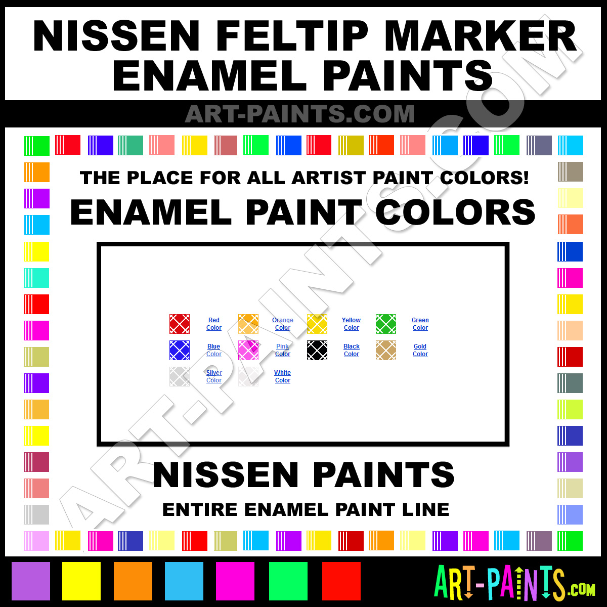 Nissen knows Enamel paints! They make a wonderful brand of paint called Nissen Feltip Marker Enamel Colors that suits all types of artists. They strive to perfect the process of color and are one of the most popular Enamel Paint Brand companies in the world. Enjoy their entire paint brand collection from the list below. Nissen makes wonderful Artists Paints that everyone is sure to enjoy! Choose an Enamel Paint Color below to view that Hue and all their great related color paints. Paint on!     -Art-Paints.com