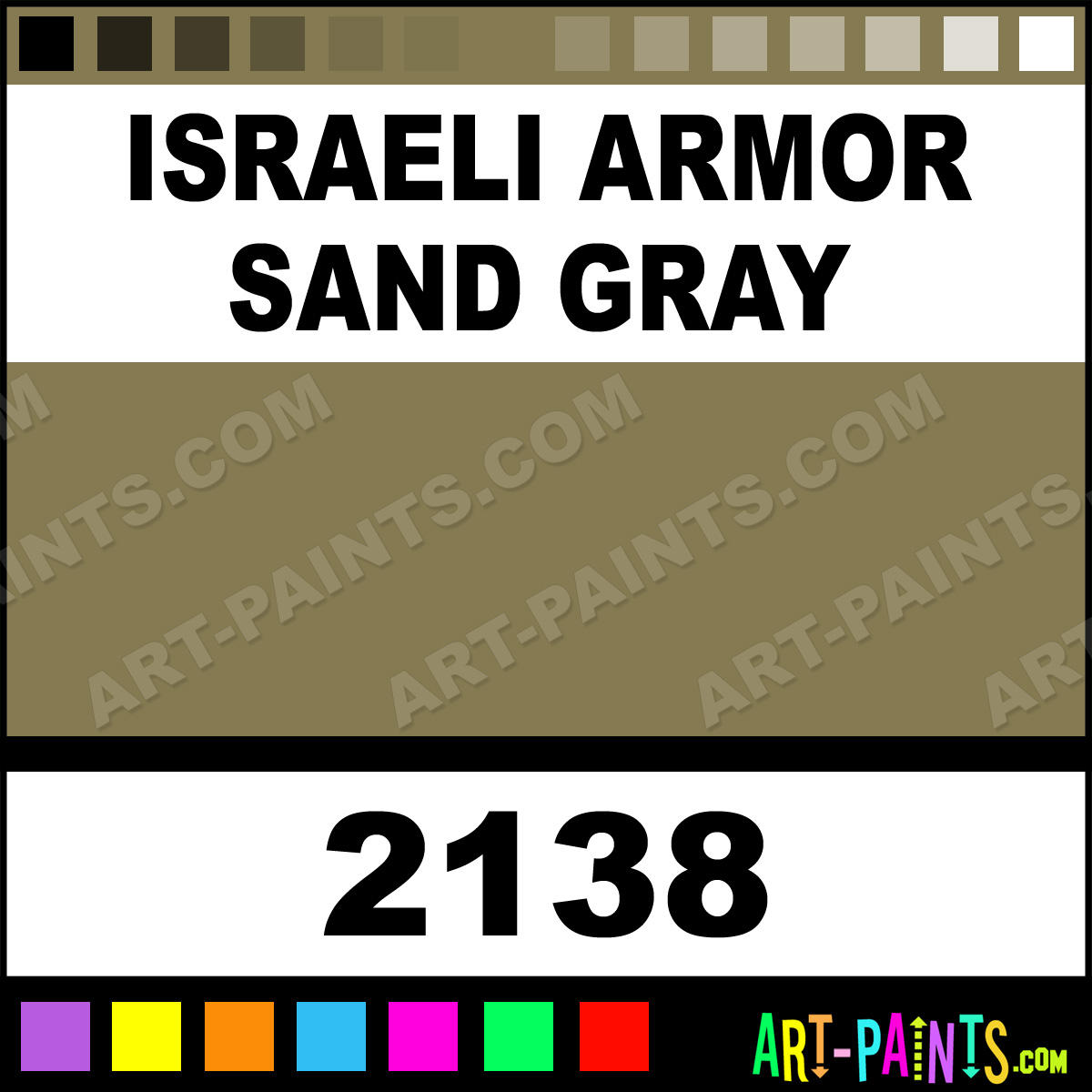 This beautiful International Military Enamel shade is called Israeli Armor Sand Gray, and comes from a company called Testors. Their product number, along with the HTML color code, RGB, and CMYK codes are listed below. This Beautiful Shade of Israeli Armor Sand Gray and others can be found in the Testors International Military Art Paint Gallery! Also be sure to browse through the other wonderful Professional Color Galleries to see more of Testors International Military Enamel Brand Paints and other Paint Manufacturers. And as always, Paint Paint Paint! -Art-Paints.com