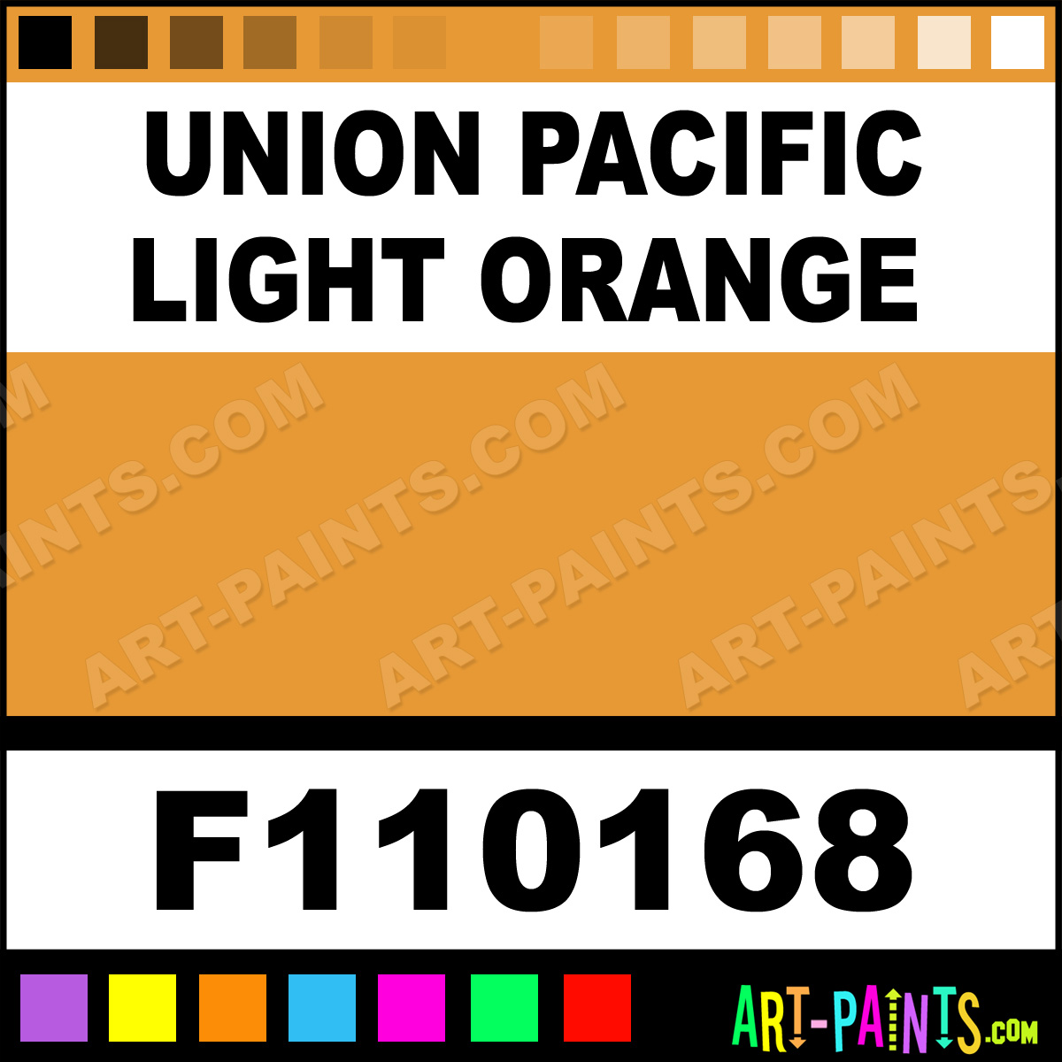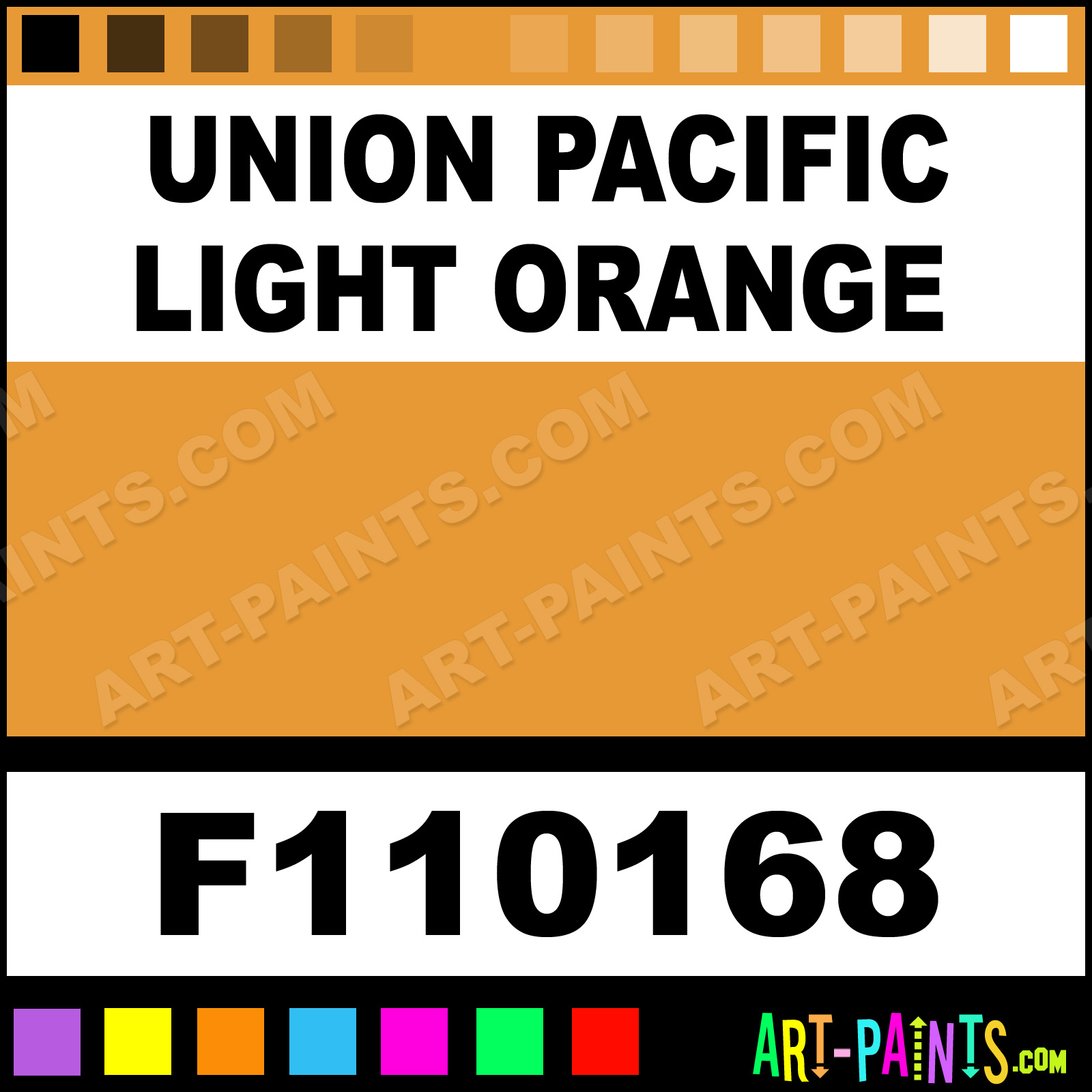 This beautiful Railroad Enamel shade is called Union Pacific Light Orange, and comes from a company called Testors. Their product number, along with the HTML color code, RGB, and CMYK codes are listed below. This Beautiful Shade of Union Pacific Light Orange and others can be found in the Testors Railroad Art Paint Gallery! Also be sure to browse through the other wonderful Professional Color Galleries to see more of Testors Railroad Enamel Brand Paints and other Paint Manufacturers. And as always, Paint Paint Paint! -Art-Paints.com