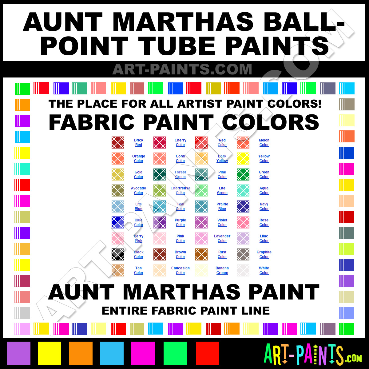 Aunt Marthas knows Fabric Textile Paints! They make a wonderful brand of paint called Aunt Marthas Ballpoint Tube Fabric Textile Colors that suits all types of artists. They strive to perfect the process of color and are one of the most popular Fabric Textile Paint Brand companies in the world. Enjoy their entire paint brand collection from the list below. Aunt Marthas makes wonderful Artists Paints that everyone is sure to enjoy! Choose an Fabric Textile Paint Color below to view that Hue and all their great related color paints. Paint on!     -Art-Paints.com
