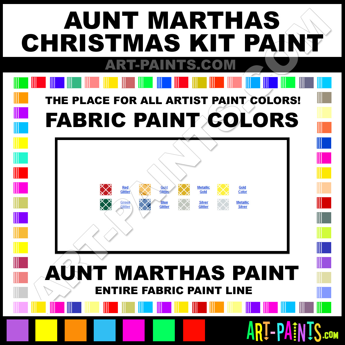 Aunt Marthas knows Fabric Textile Paints! They make a wonderful brand of paint called Aunt Marthas Christmas Kit Fabric Textile Colors that suits all types of artists. They strive to perfect the process of color and are one of the most popular Fabric Textile Paint Brand companies in the world. Enjoy their entire paint brand collection from the list below. Aunt Marthas makes wonderful Artists Paints that everyone is sure to enjoy! Choose an Fabric Textile Paint Color below to view that Hue and all their great related color paints. Paint on!     -Art-Paints.com