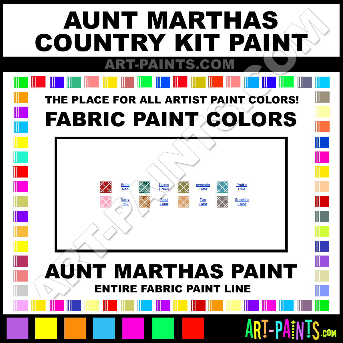 Aunt Marthas knows Fabric Textile Paints! They make a wonderful brand of paint called Aunt Marthas Country Kit Fabric Textile Colors that suits all types of artists. They strive to perfect the process of color and are one of the most popular Fabric Textile Paint Brand companies in the world. Enjoy their entire paint brand collection from the list below. Aunt Marthas makes wonderful Artists Paints that everyone is sure to enjoy! Choose an Fabric Textile Paint Color below to view that Hue and all their great related color paints. Paint on!     -Art-Paints.com