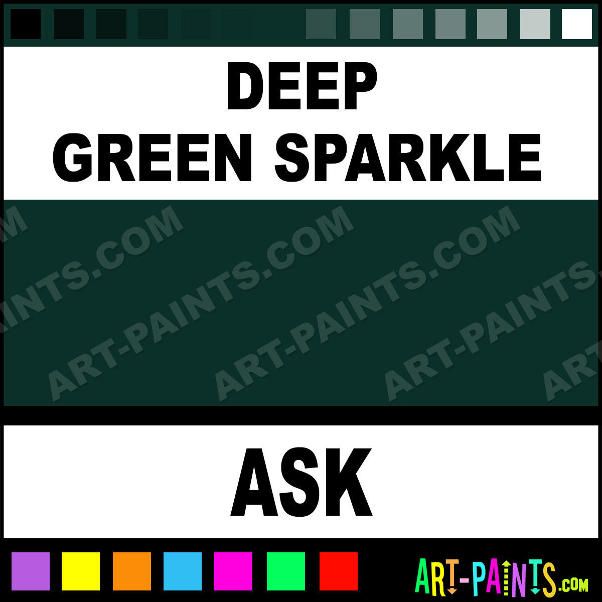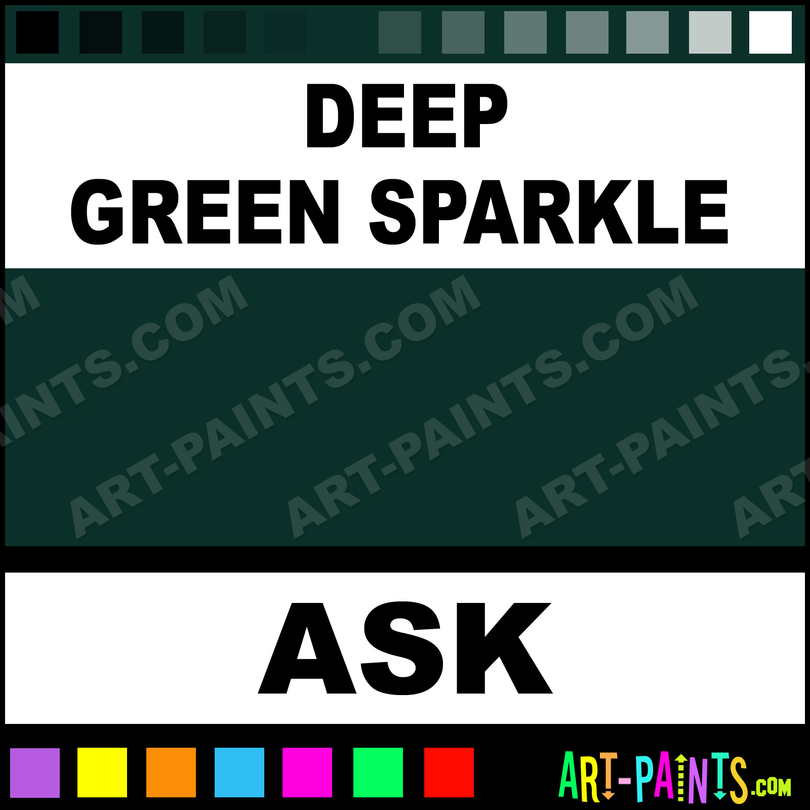 This beautiful All Sparkle Kit Fabric Textile shade is called Deep Green Sparkle, and comes from a company called Gingers Cameo. Their product number, along with the HTML color code, RGB, and CMYK codes are listed below. This Beautiful Shade of Deep Green Sparkle and others can be found in the Gingers Cameo All Sparkle Kit Art Paint Gallery! Also be sure to browse through the other wonderful Professional Color Galleries to see more of Gingers Cameo All Sparkle Kit Fabric Textile Brand Paints and other Paint Manufacturers. And as always, Paint Paint Paint! -Art-Paints.com