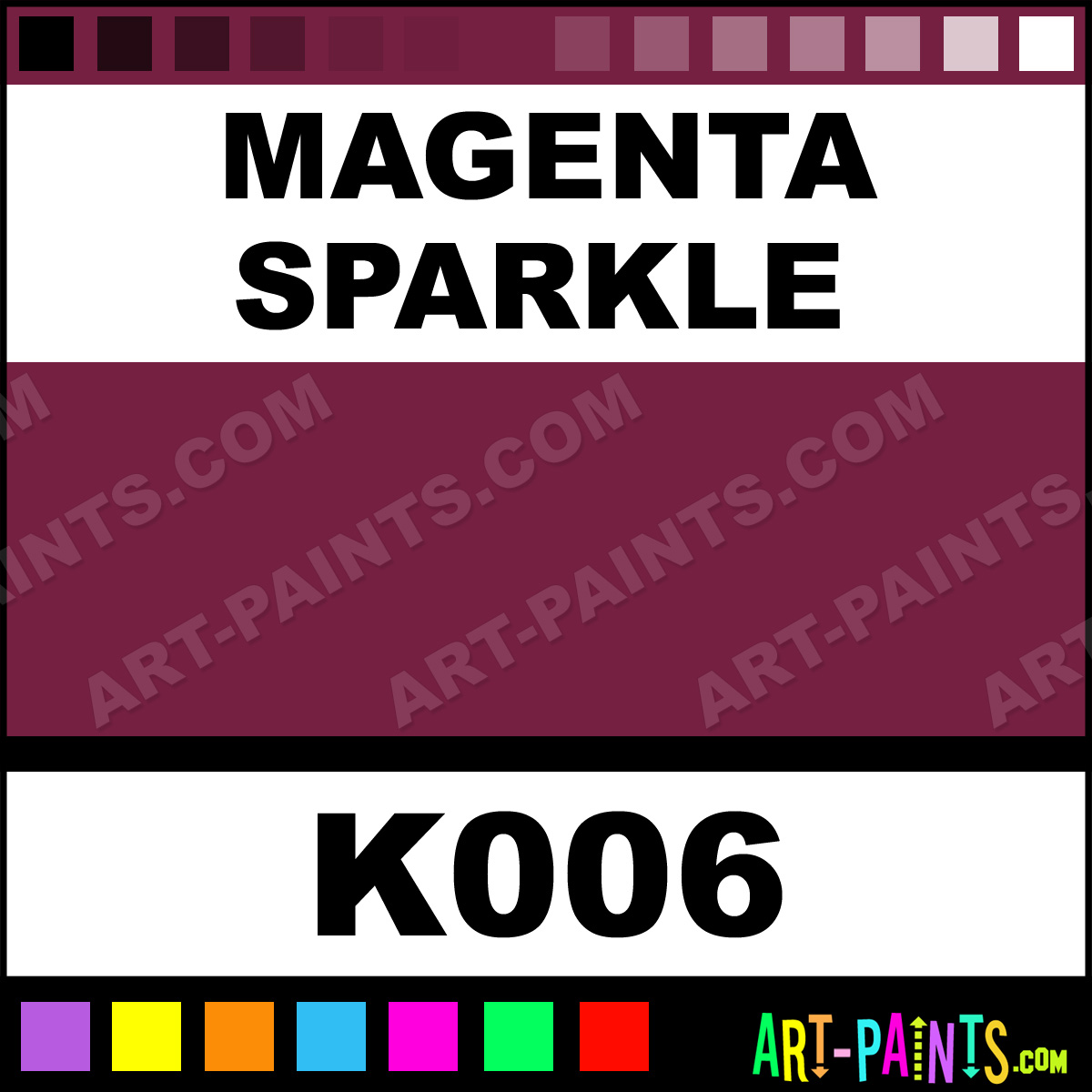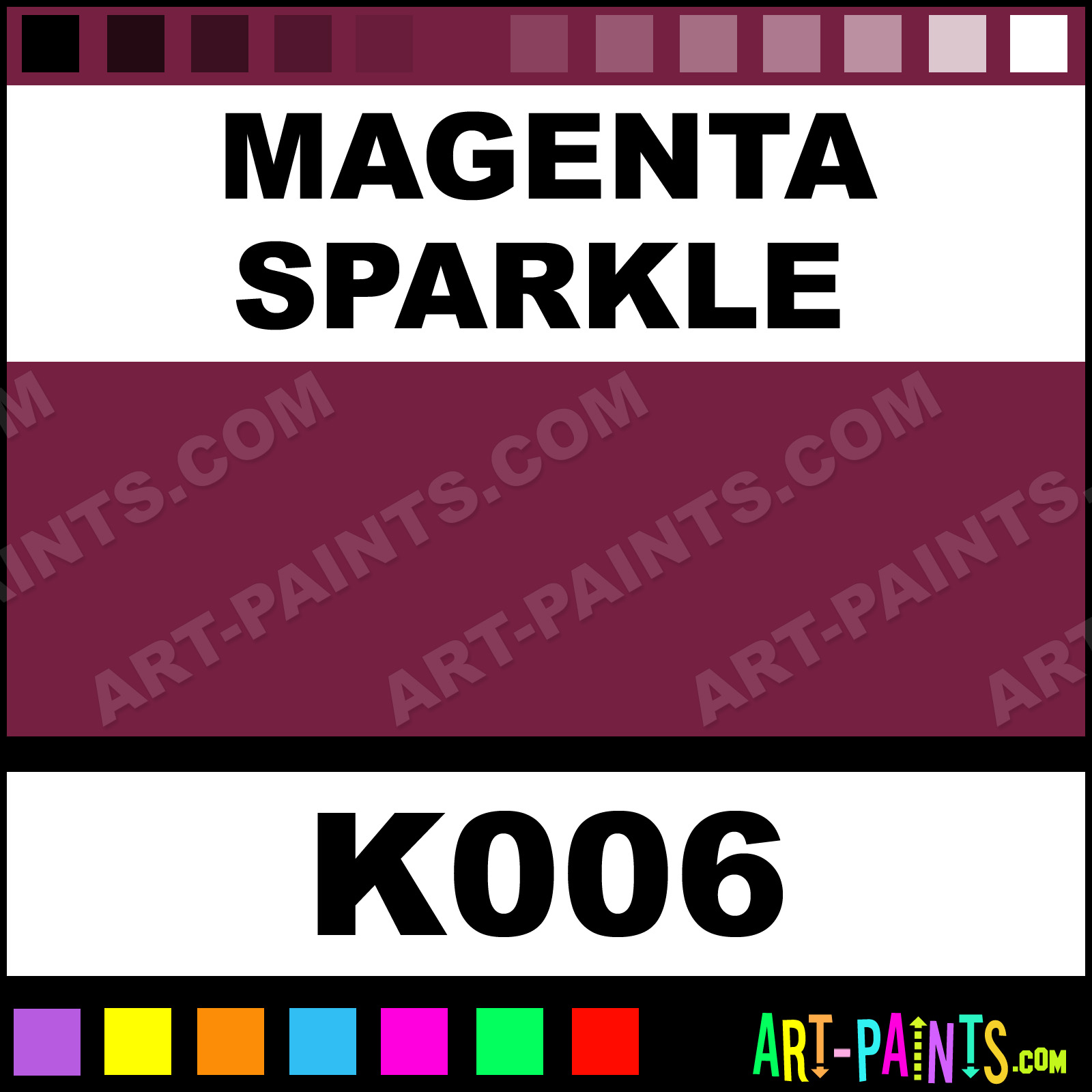 This beautiful Sparkle Kit Fabric Textile shade is called Magenta Sparkle, and comes from a company called Gingers Cameo. Their product number, along with the HTML color code, RGB, and CMYK codes are listed below. This Beautiful Shade of Magenta Sparkle and others can be found in the Gingers Cameo Sparkle Kit Art Paint Gallery! Also be sure to browse through the other wonderful Professional Color Galleries to see more of Gingers Cameo Sparkle Kit Fabric Textile Brand Paints and other Paint Manufacturers. And as always, Paint Paint Paint! -Art-Paints.com