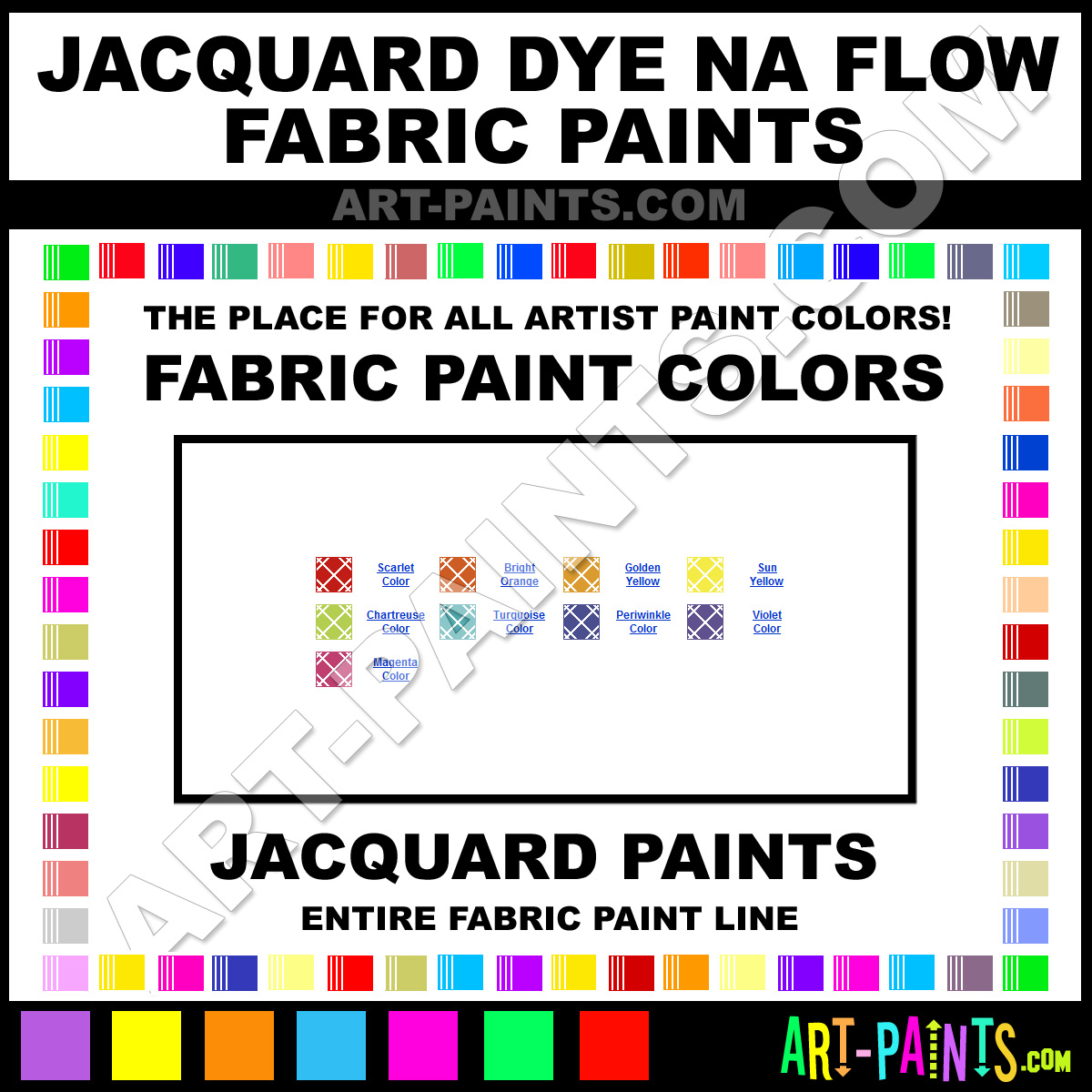 Jacquard knows Fabric Textile Paints! They make a wonderful brand of paint called Jacquard Dye Na Flow 9 Set Fabric Textile Colors that suits all types of artists. They strive to perfect the process of color and are one of the most popular Fabric Textile Paint Brand companies in the world. Enjoy their entire paint brand collection from the list below. Jacquard makes wonderful Artists Paints that everyone is sure to enjoy! Choose an Fabric Textile Paint Color below to view that Hue and all their great related color paints. Paint on!     -Art-Paints.com