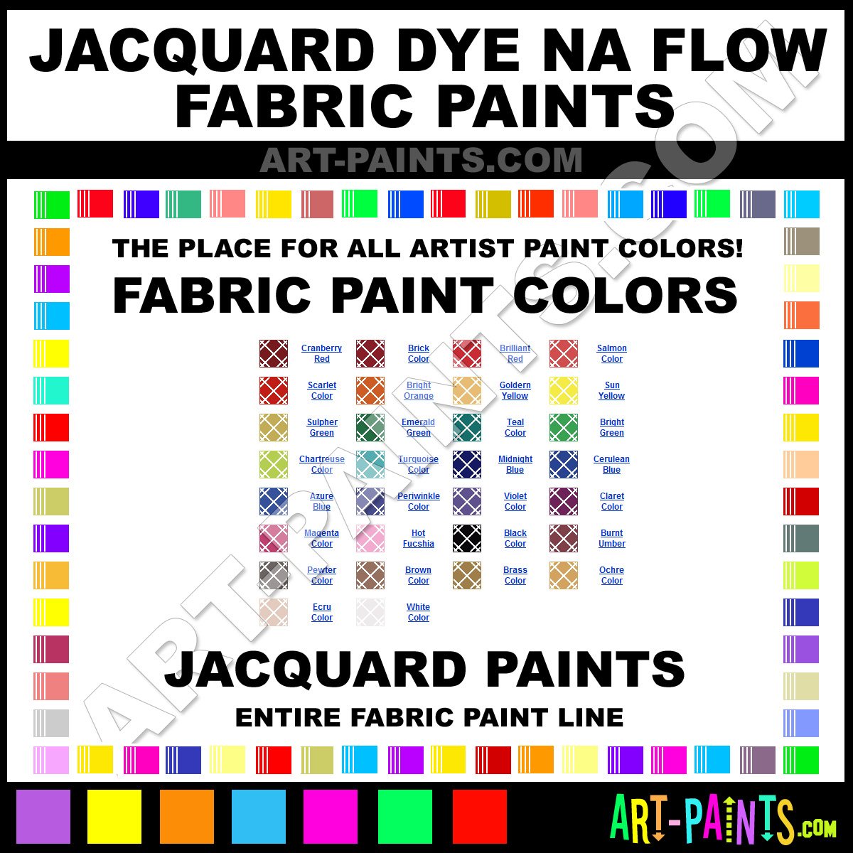 Jacquard knows Fabric Textile Paints! They make a wonderful brand of paint called Jacquard Dye Na Flow Fabric Textile Colors that suits all types of artists. They strive to perfect the process of color and are one of the most popular Fabric Textile Paint Brand companies in the world. Enjoy their entire paint brand collection from the list below. Jacquard makes wonderful Artists Paints that everyone is sure to enjoy! Choose an Fabric Textile Paint Color below to view that Hue and all their great related color paints. Paint on!     -Art-Paints.com