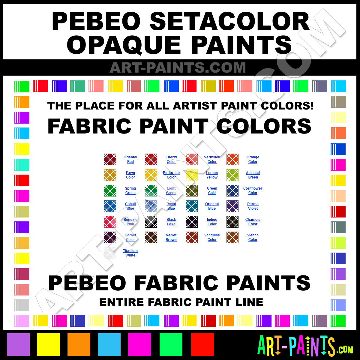 Pebeo knows Fabric Textile Paints! They make a wonderful brand of paint called Pebeo Setacolor Opaque Fabric Textile Colors that suits all types of artists. They strive to perfect the process of color and are one of the most popular Fabric Textile Paint Brand companies in the world. Enjoy their entire paint brand collection from the list below. Pebeo makes wonderful Artists Paints that everyone is sure to enjoy! Choose an Fabric Textile Paint Color below to view that Hue and all their great related color paints. Paint on!     -Art-Paints.com