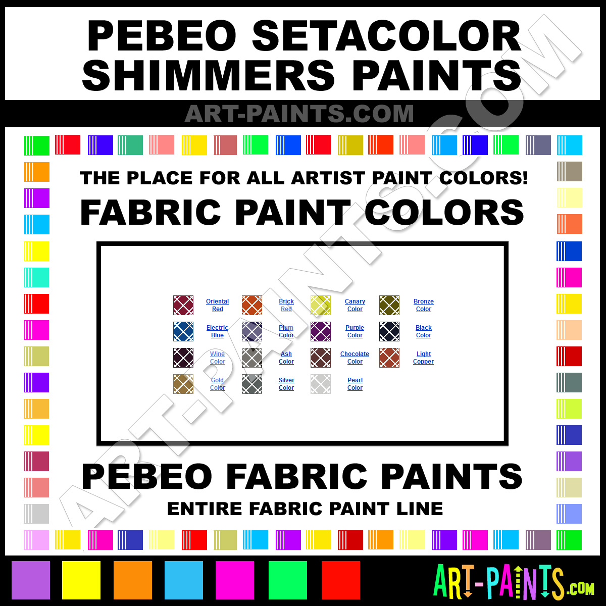 Pebeo makes a beautiful Setacolor Shimmers Paint Brand. With a complete line of Fabric Textile Color Paints, 15 colors in all, available in beautiful hues and colors, they will no doubt keep you painting and smiling at the same time. This brand is very unique and exquisite!