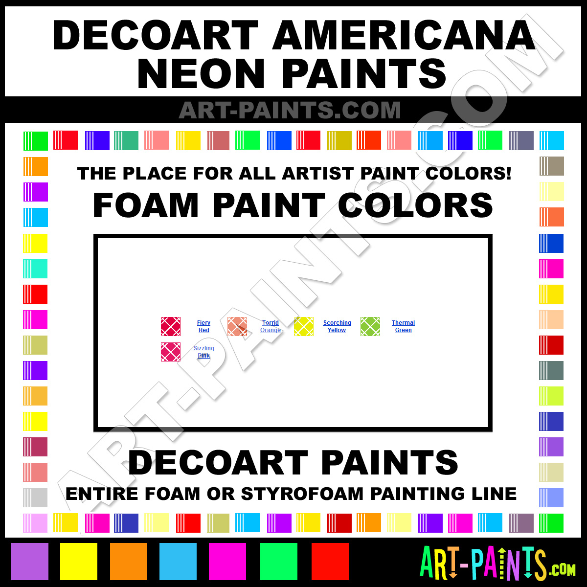 DecoArt knows Foam and Styrofoam Paints! They make a wonderful brand of Foam Paint called DecoArt Americana Neons Foam Colors that suits all types of Artists, whether it be Foamy Paint, or Paint for Foam, they strive to perfect the process of Color and are one of the most popular Foam Paint Brand companies in the world. Enjoy their entire paint brand collection from the list below. DecoArt makes wonderful Artists Styrofoam Paints that everyone is sure to enjoy! Choose an Foam or Styrofoam Paint below to view that Hue, Tone and all their great related Colors!     -Art-Paints.com