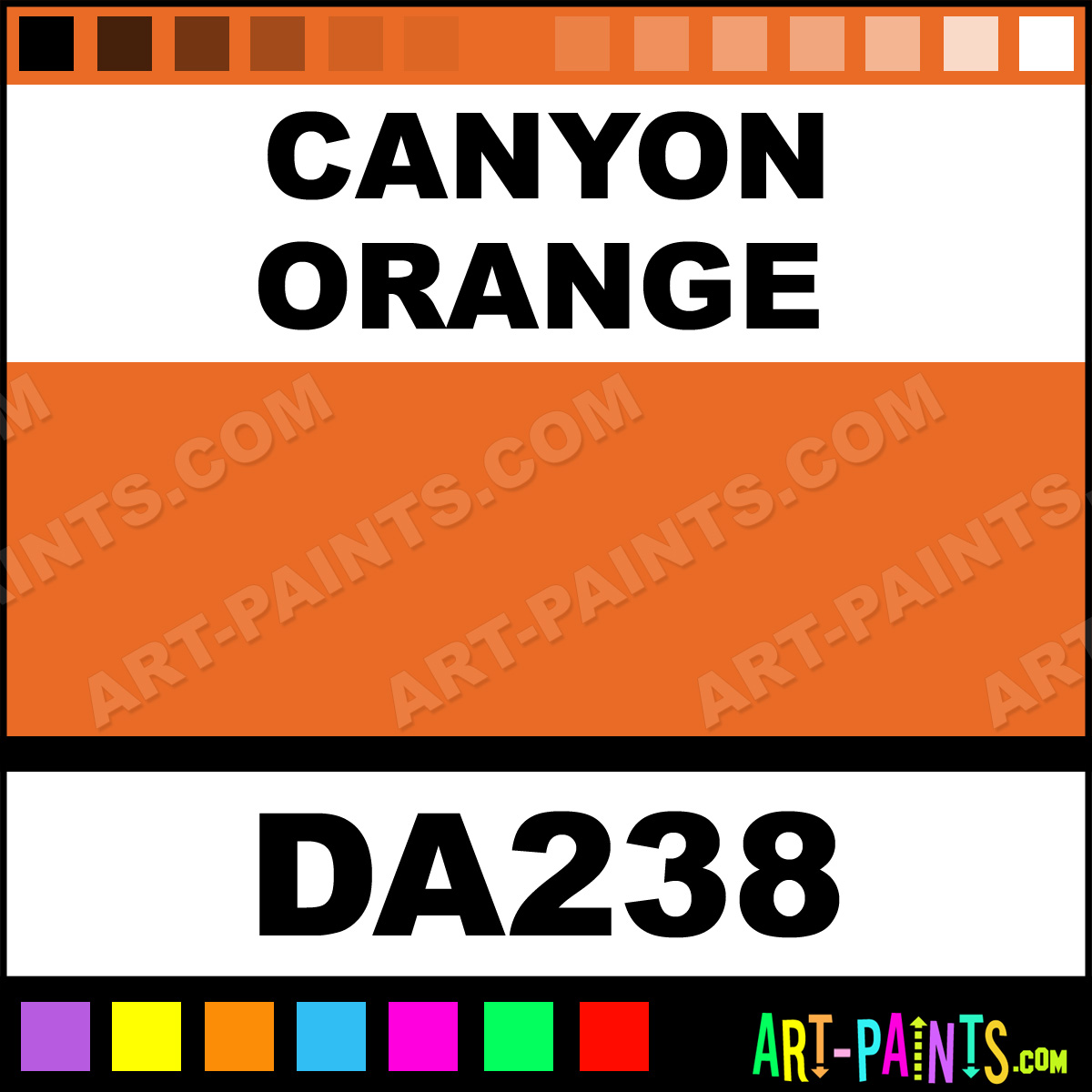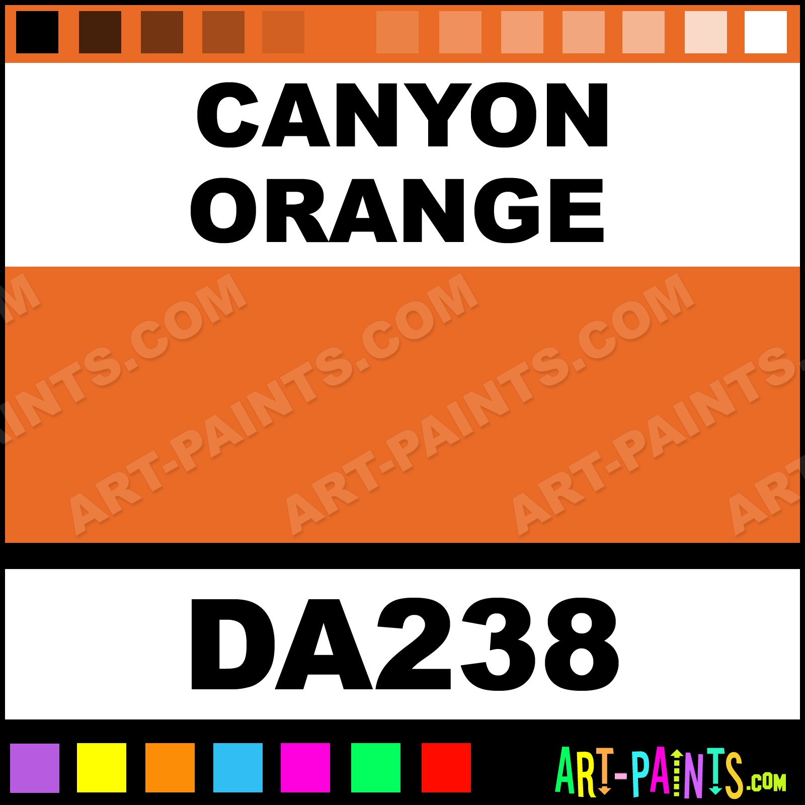 This beautiful Americana Foam shade is called Canyon Orange, and comes from a company called DecoArt. Whether it be for Foam Painting or Painting on Foam, their product number, along with the HTML color code, RGB, and CMYK codes are listed below. This Beautiful Styrofoam Shade of Canyon Orange and others can be found in the DecoArt Americana Paint Gallery! Also be sure to browse through the other Professional Foam Galleries to see more of DecoArt Americana Foam Paints and other Styrofoam Paint Manufacturers!   -Art-Paints.com