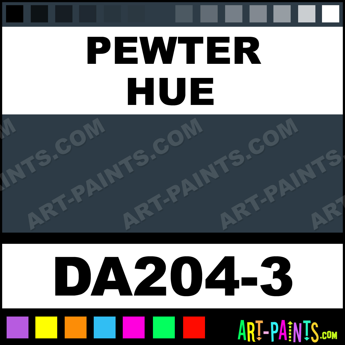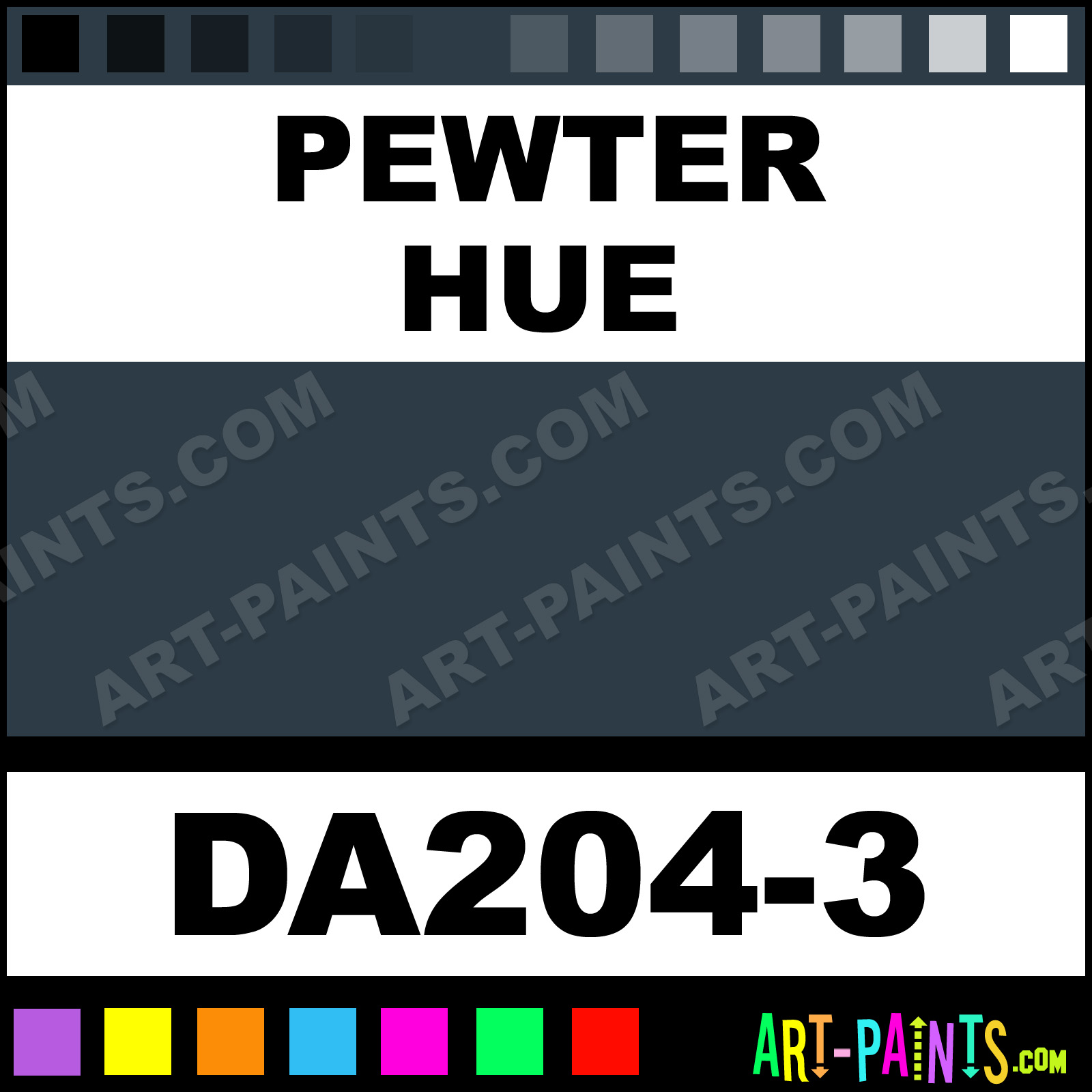 This beautiful Dazzling Metallics Foam shade is called Pewter, and comes from a company called DecoArt. Whether it be for Foam Painting or Painting on Foam, their product number, along with the HTML color code, RGB, and CMYK codes are listed below. This Beautiful Styrofoam Shade of Pewter and others can be found in the DecoArt Dazzling Metallics Paint Gallery! Also be sure to browse through the other Professional Foam Galleries to see more of DecoArt Dazzling Metallics Foam Paints and other Styrofoam Paint Manufacturers!   -Art-Paints.com