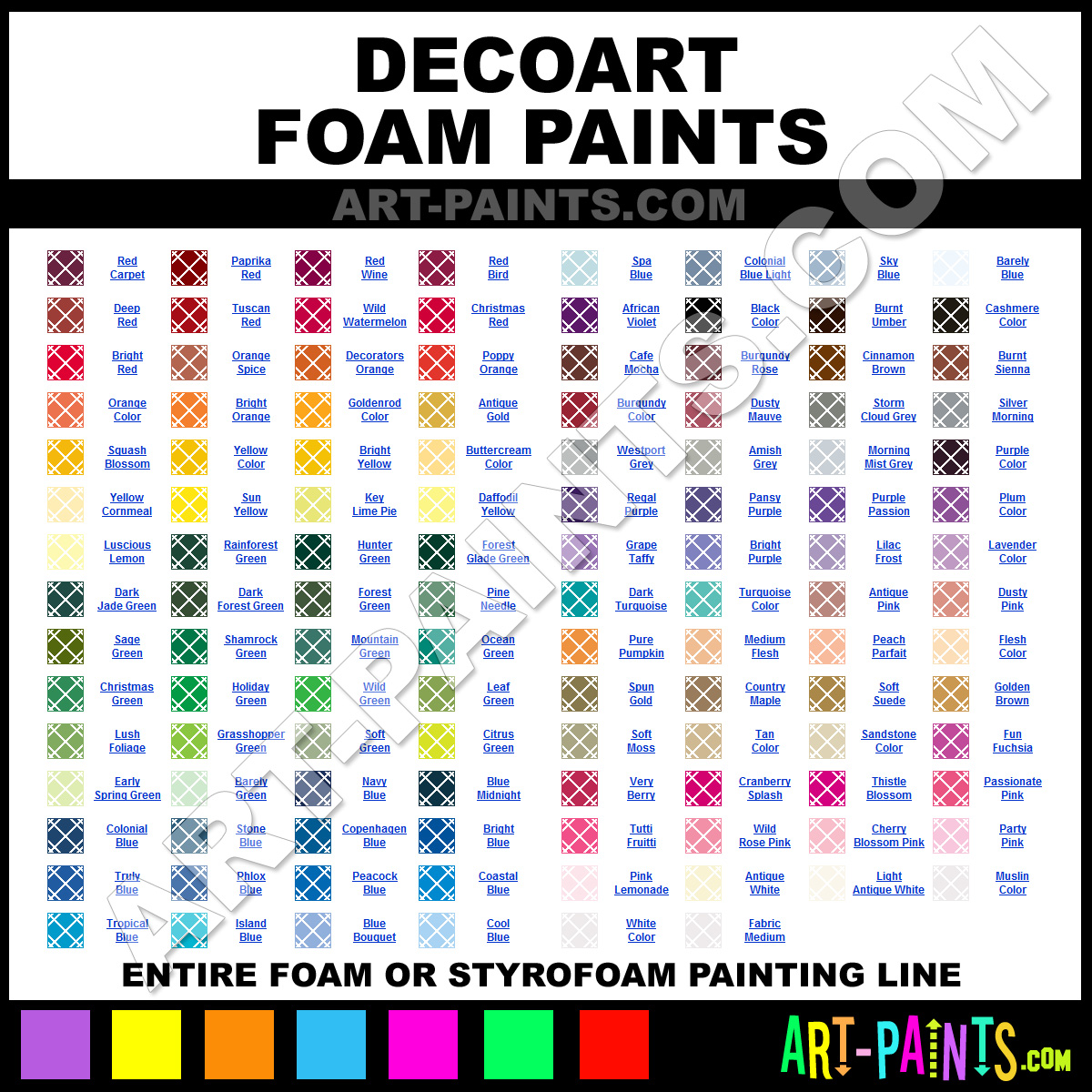 DecoArt knows Foam Paints! They make wonderful brands of Paint for all types of Foam Painting or Painting on Foam. They strive to perfect the process of color and are one of the most popular Foam Paint Brand companies in the World. DecoArt makes a couple different types of Foam Paint Brands including its Americana Paints, Americana Neon Paints, Americana Stucco Paints, Americana Writer Paints, Craft Twinkle Paints, Craft Twinkle Writer Paints, Crafters Paints, Dazzling Metallic Paints, Foam Paints, Halloween Paints, Outdoor Glitter Paints, Paper Effects Paints, Paper Perfect Paints, Patio Paints, Patio Spray Paints, Royal Metallic Paints, SoSoft Paints, Texture Crackle Paints, Texture Fierro Paints, Texture Terra Cotta Paints and Sandstones Foam Paints! Choose a Paint type below to view those Hues and Colors!     -Art-Paints.com