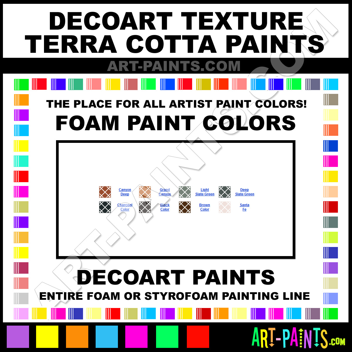 DecoArt knows Foam and Styrofoam Paints! They make a wonderful brand of Foam Paint called DecoArt Texture Terra Cotta Foam Colors that suits all types of Artists, whether it be Foamy Paint, or Paint for Foam, they strive to perfect the process of Color and are one of the most popular Foam Paint Brand companies in the world. Enjoy their entire paint brand collection from the list below. DecoArt makes wonderful Artists Styrofoam Paints that everyone is sure to enjoy! Choose an Foam or Styrofoam Paint below to view that Hue, Tone and all their great related Colors!     -Art-Paints.com