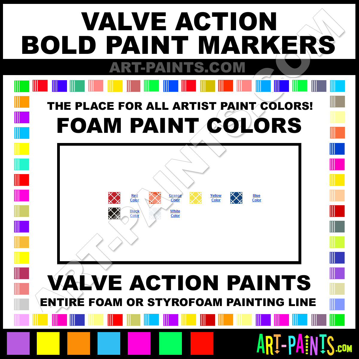 Valve Action knows Foam and Styrofoam Paints! They make a wonderful brand of Foam Paint called Valve Action Bold Marker Foam Colors that suits all types of Artists, whether it be Foamy Paint, or Paint for Foam, they strive to perfect the process of Color and are one of the most popular Foam Paint Brand companies in the world. Enjoy their entire paint brand collection from the list below. Valve Action makes wonderful Artists Styrofoam Paints that everyone is sure to enjoy! Choose an Foam or Styrofoam Paint below to view that Hue, Tone and all their great related Colors!     -Art-Paints.com