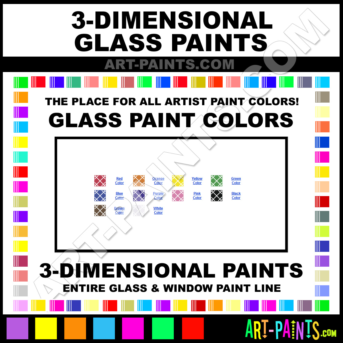 3-Dimensional knows Glass Window Paints! They make a wonderful brand of paint, stains and inks called 3-Dimensional Paint Set Glass Colors that suits all types of artists. They strive to perfect the process of color and are one of the most popular Glass Paint Brand companies in the world. Enjoy their entire paint brand collection from the list below. 3-Dimensional makes wonderful Paints that everyone is sure to enjoy, especially Stained Glass Artists! Choose a Glass Paint below to view that Hue, Tone and all their wonderful Colors.     -Art-Paints.com